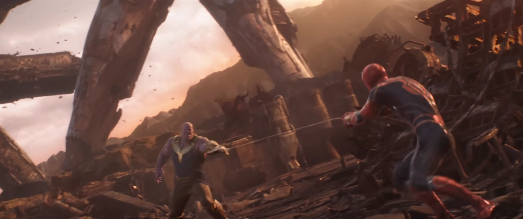 Mientras Parker usó sus telarañas para enredar los hombros de Thanos, Stark recuperado se abalanzó, tomando el lugar de Strange para sostener el Guantelete. Por otro lado, Parker intento sujetarlo pero como el Titán Loco era muy fuerte para él, activo los brazos mecánicos de su traje.