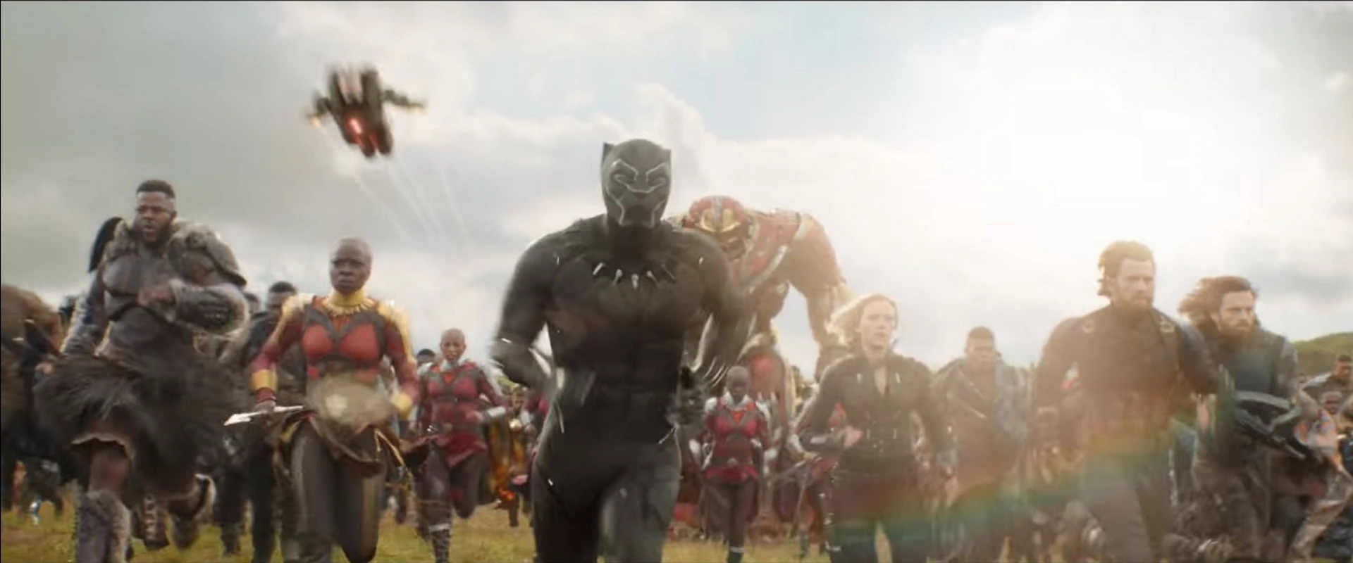 Воитель бомбит Аутрайдеров, когда Вакандская армия держит строй.