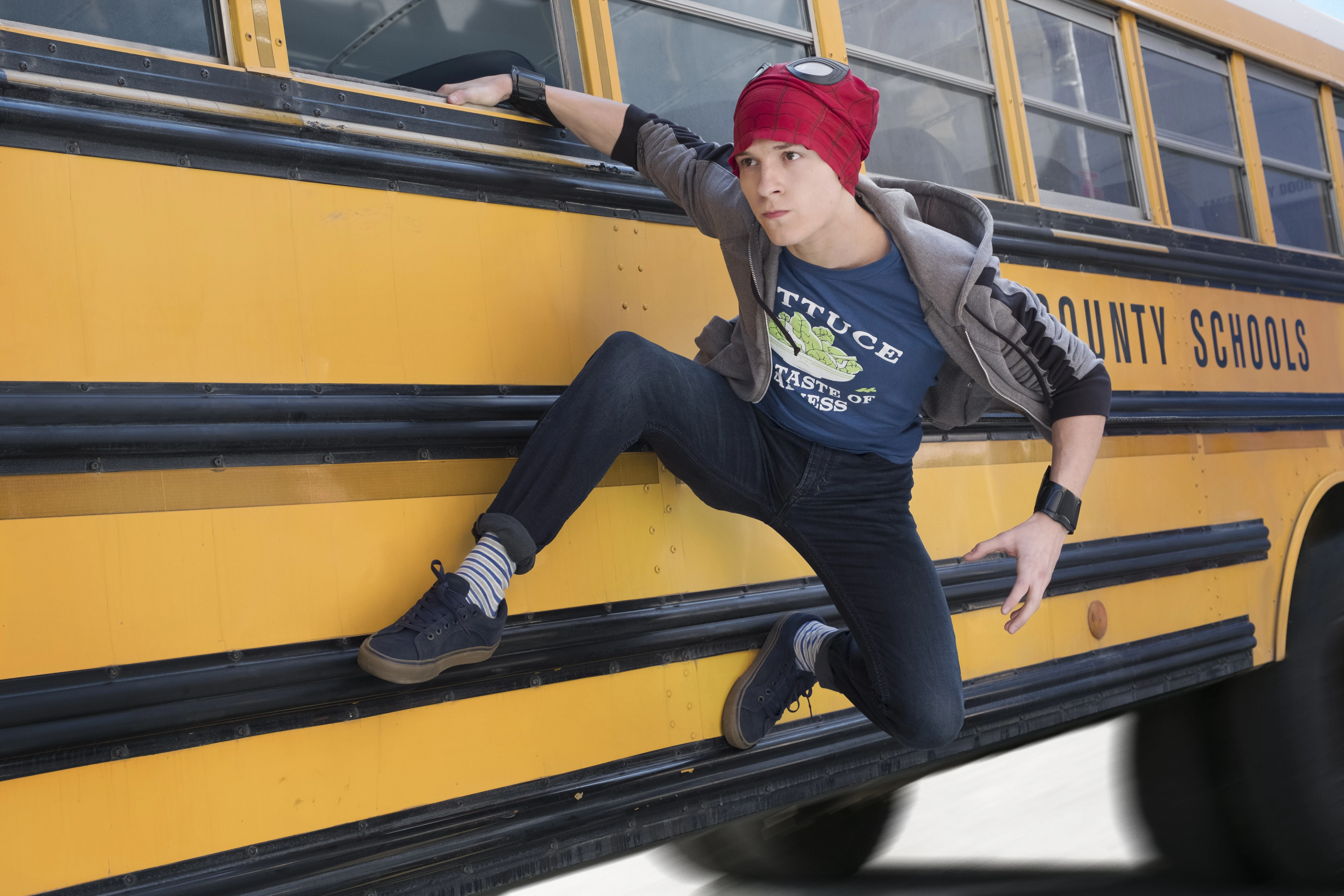Из окна школьного автобуса Питер Паркер видит Q-Ship и покидает автобус и надевает костюм Человека-паука, после того как все были отвлечены кораблём.