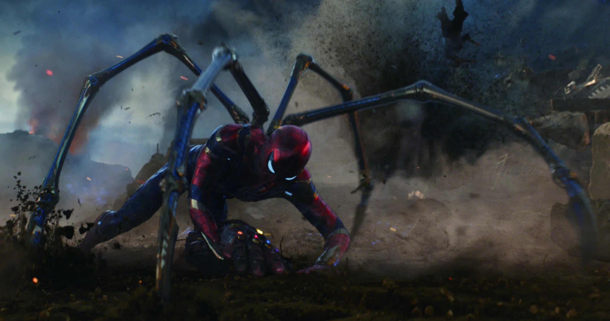 - Паучьи лапки: Костюм оборудован четырьмя бронированными паучьими лапами внутри символа паука, который находится на его спине. Эти лапы выдержали удары Таноса. Питер использовал их с перерывом, чтобы замедлить себя после того, как поймал Мантис в воздухе, или чтобы схватить Доктора Стрэнджа, который чуть не попал в открытий космос.