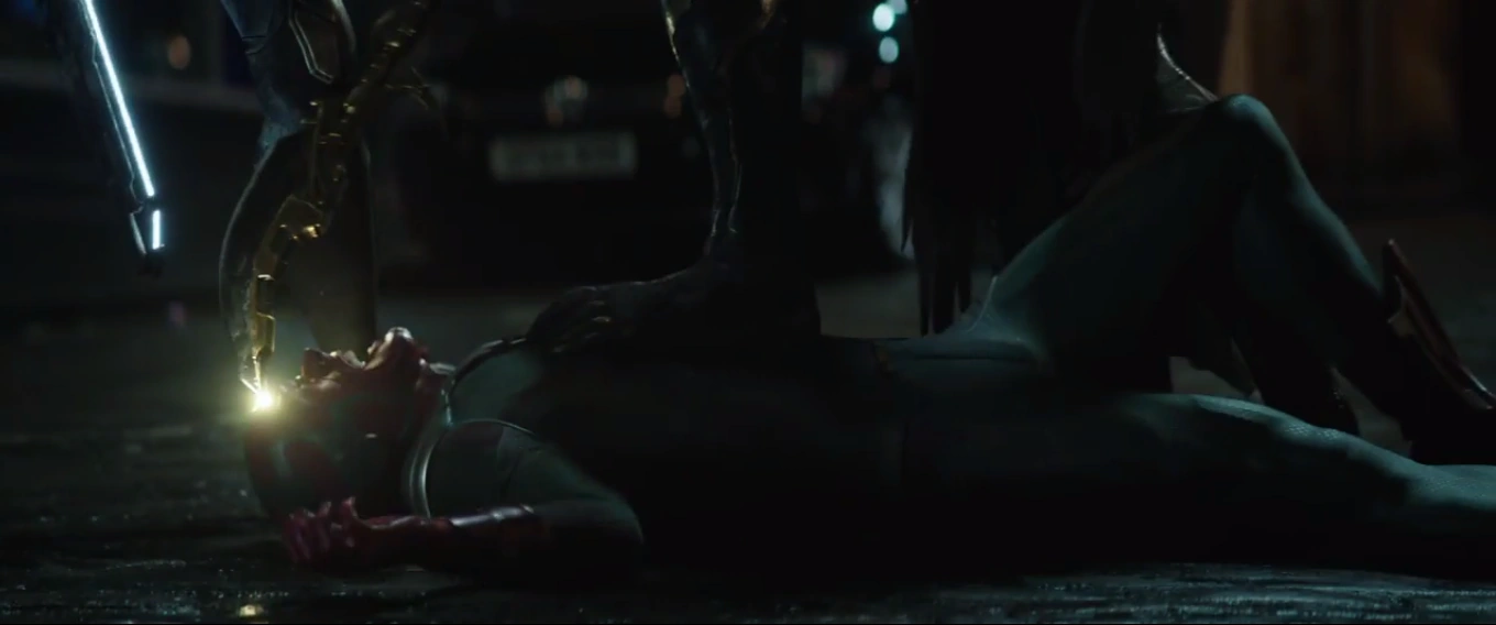 До того, как Вижен смог ответить Ванде, его проткнул глефой Корвусы Глефы, тогда маскировка в форме человека отключилась, и вновь стал андройдом. До того, как Алая ведьма смогла помочь ему, в неё стрельнула из копья Проксима Полночная, позволив Корвусу попытаться снять камень разума со лба. Однако, прежде чем он смог это сделать, Ванда откинула Чёрный орден, взяла Вижена, и они полетели от них. Вижен понял, что рана лишает его сил, и Ванда использует свои способности, чтобы вылечить рану. Пока Ванда вылечивала рану, на них вновь напал Корвус Глефа. Вижен захватил Корвуса и начялили биться на крыше, а Ванда сражалась с Проксимой в бою один на один.
