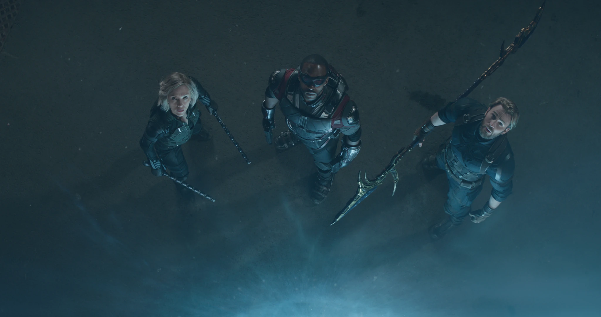 Стив Роджерс, Наташа Романофф и Сэм Уилсон смотрят, как Корвус Глефа и Проксима Полночная улетают на Q-Ship.