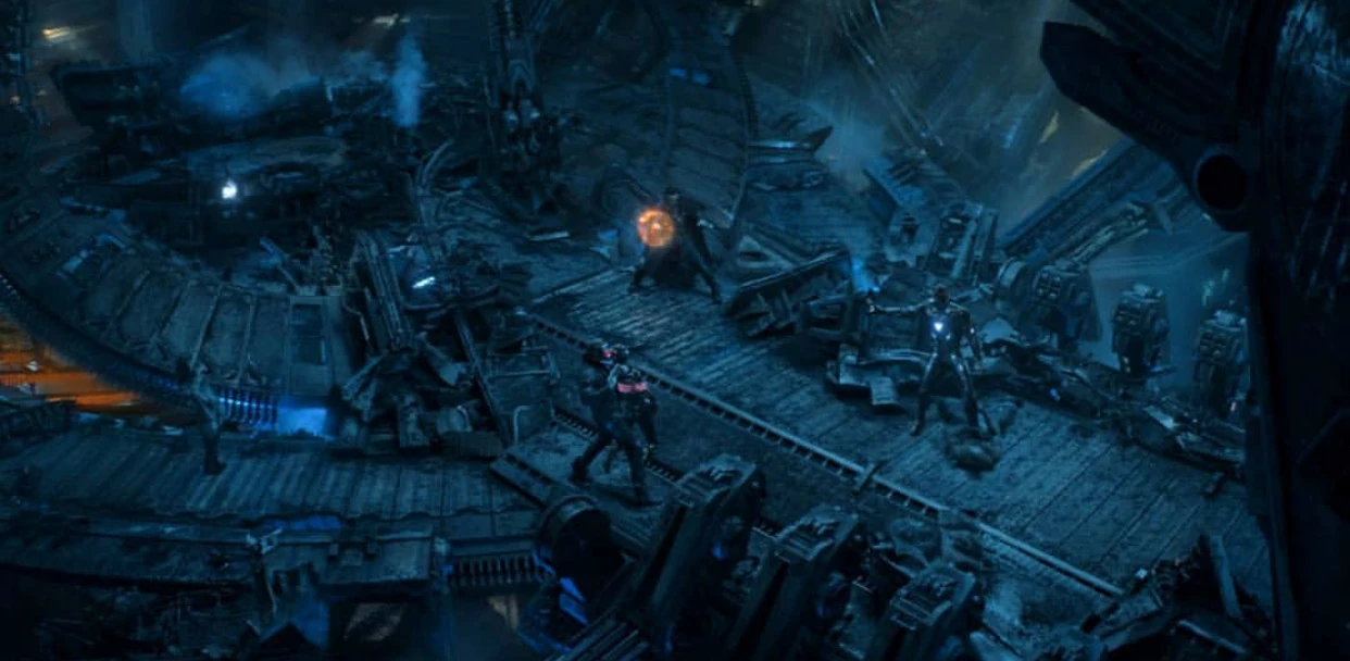 Вакандская армия и Мстители сражается против Аутрайдеров.