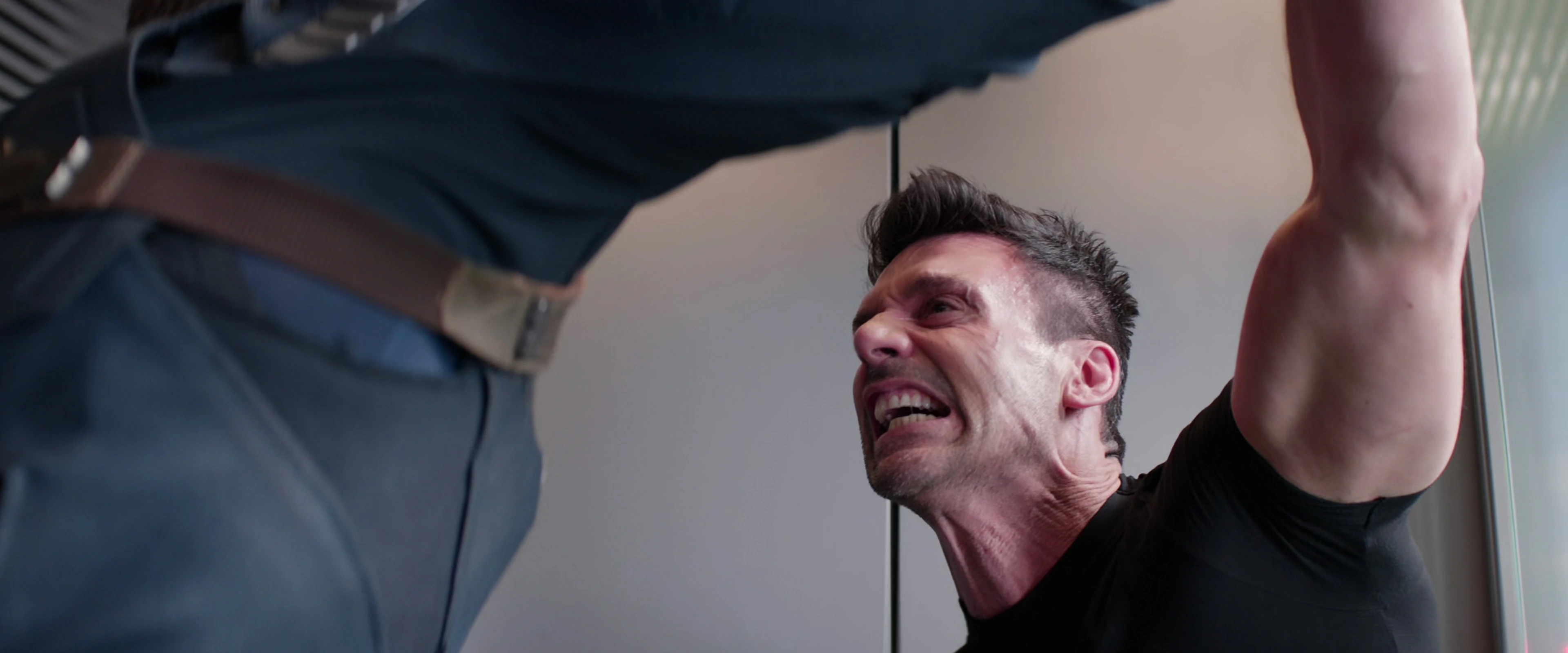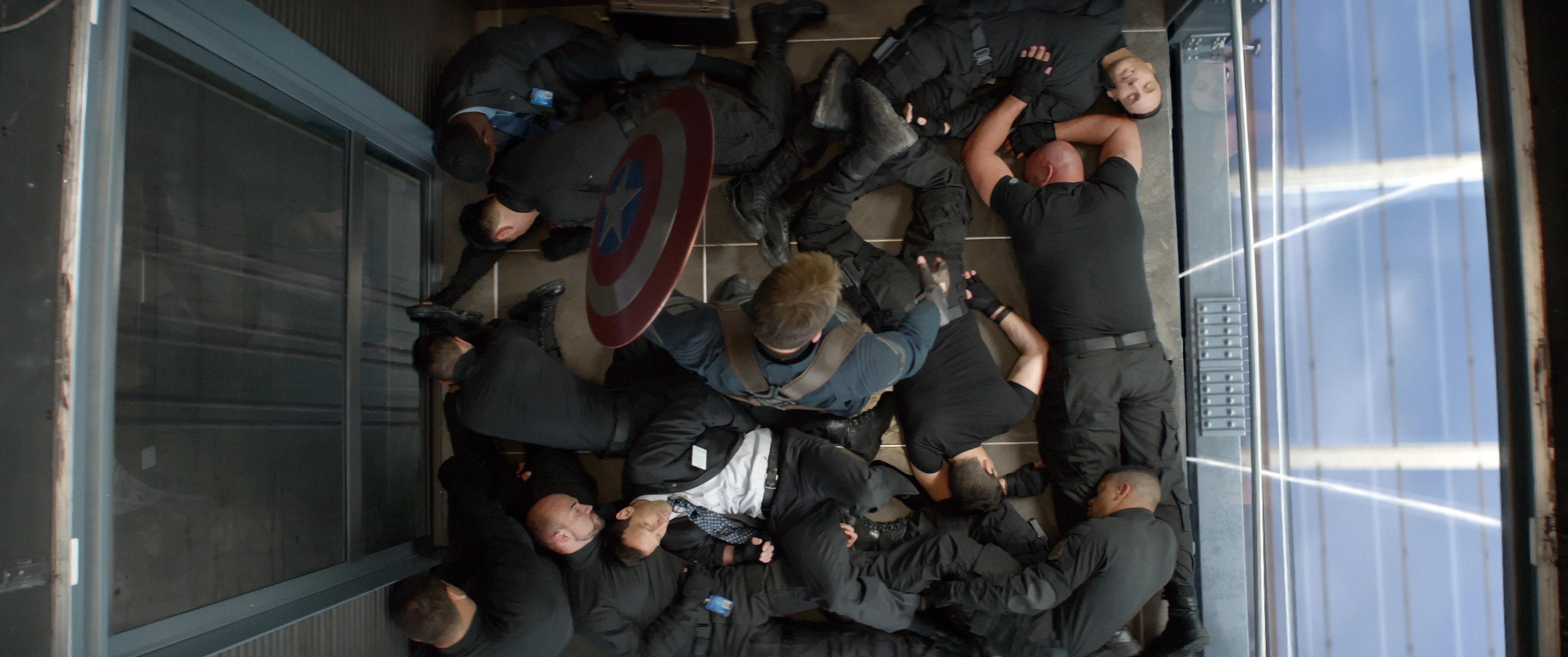 После разговора с Пирсом Капитан Америка, намереваясь покинуть Трискелион, заходит в лифт, который быстро заполняется бойцами УДАРа и другими агентами. Когда Роджерс понимает замысел, окруживших его людей, то подвергается нападению. Стив одолевает всех, включая Брока Рамлоу, который вместе с ним участвовал с спасательной операции на Лемурианской Звезде.