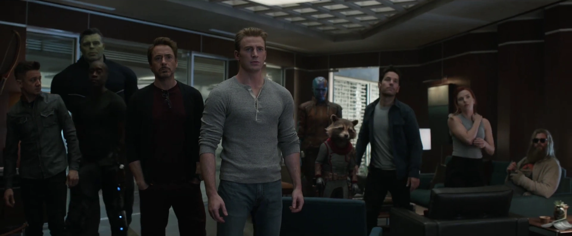 Затем Мстители надевают усовершенствованные технические костюмы и отправились к платформе, где Капитан Америка говорит, что эта их единственная возможность вернуть всех погибших. Соколиный глаз сжал уменьшенный Бенатар, который он взял с собой, а потом Енот Ракета сказал ему вернуть корабль без повреждений. Брюс Беннер активировал машину времени, и все они переместились в квантовое измерение, где каждый из них отправился в определённую точку во времени.