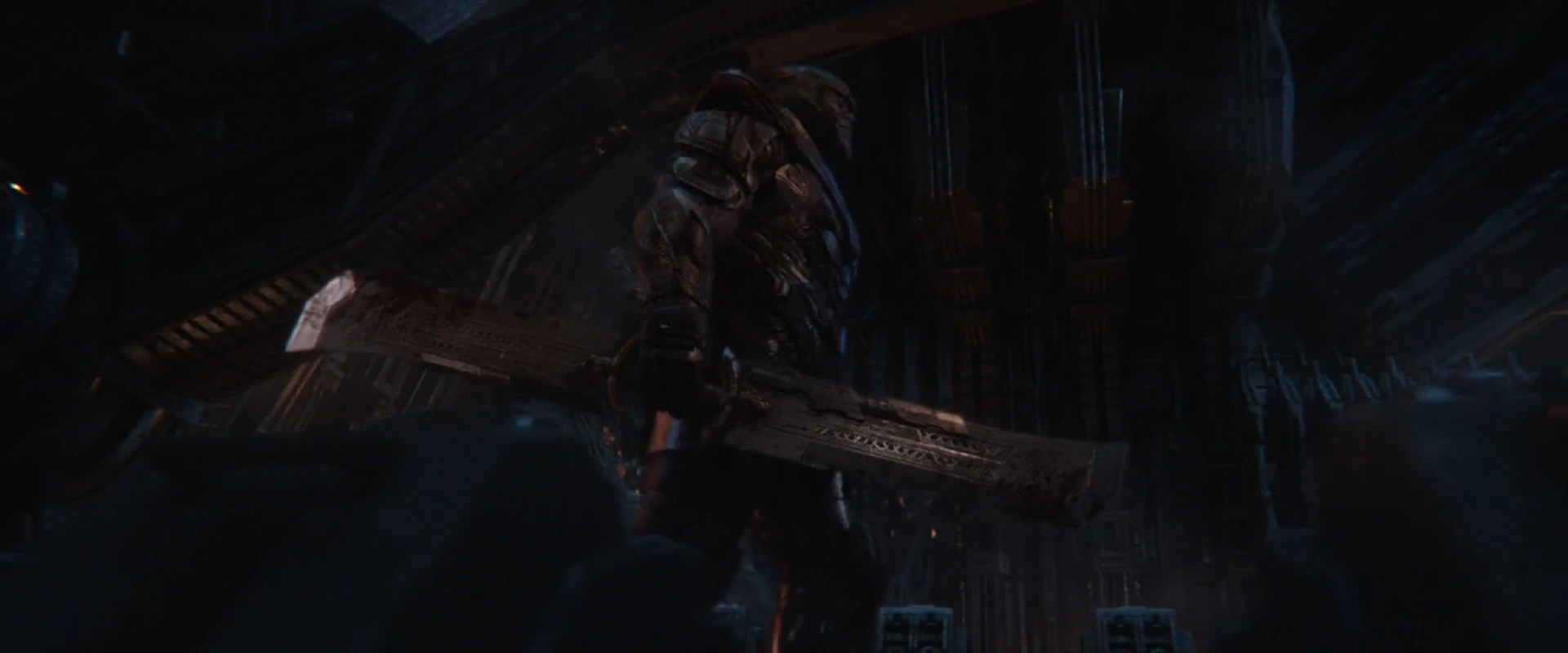 Танос воспользовался этой возможностью и хватает Железного человека, но на него нападает Тор и использует против него Мьёльнир, однако он отбивает его нападение Тони Старком, как щит, чтобы потом отбить его. После того, как он оглушает Роджерса, выводя его из боя, Танос использует свой обоюдоострый меч против Тора, который отбивал удары громсекирой.