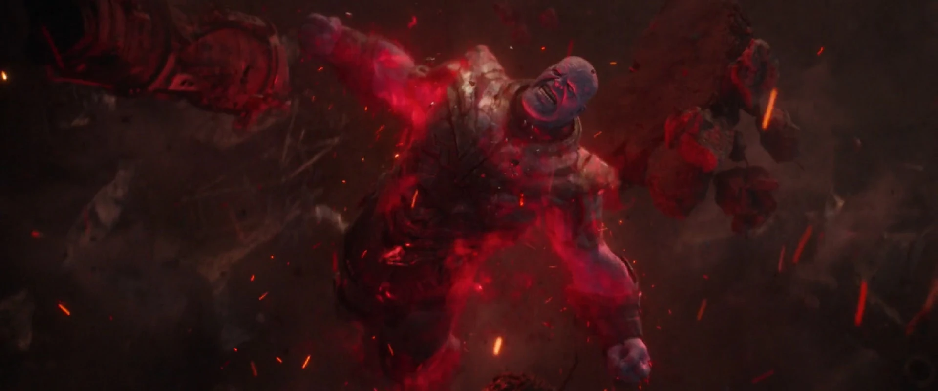 Танос пытался забрать перчатку у Чёрной пантеры, но его останавливает Алая ведьма, которая говорит ему, что он забрал всё, что у неё было, хоть сам Танос и не знал её. Затем Танос избежал нескольких летящих на него огромный обломков, благодаря телекинетическим способностям Алой ведьмы. Несмотря на то, что Танос ненадолго одержал верх, Алой ведьме всё же удалось сокрушить Безумного Титана, разорвав часть его брони и уничтожив его обоюдоострый меч.
