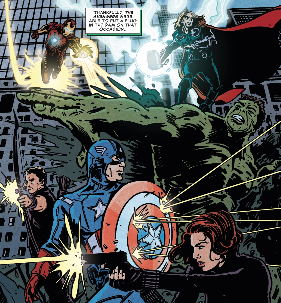 - Битва за Нью-Йорк: Мстители собираются вместе в круг, готовые сражаться, поскольку всё больше и больше Левианфанов падает не небес. Халк находит Локи и сильно избивает его. Чёрная вдова и освободившийся от контроля разума Селвиг с помощью Скипетра пытаются закрыть портал. В это время, Совет мировой безопасности, разубедившись в том, что Мстители могут остановить вторжение, решают запустить ядерную ракету в Нью-Йорк, несмотря на сопротивление Ника Фьюри.[5]