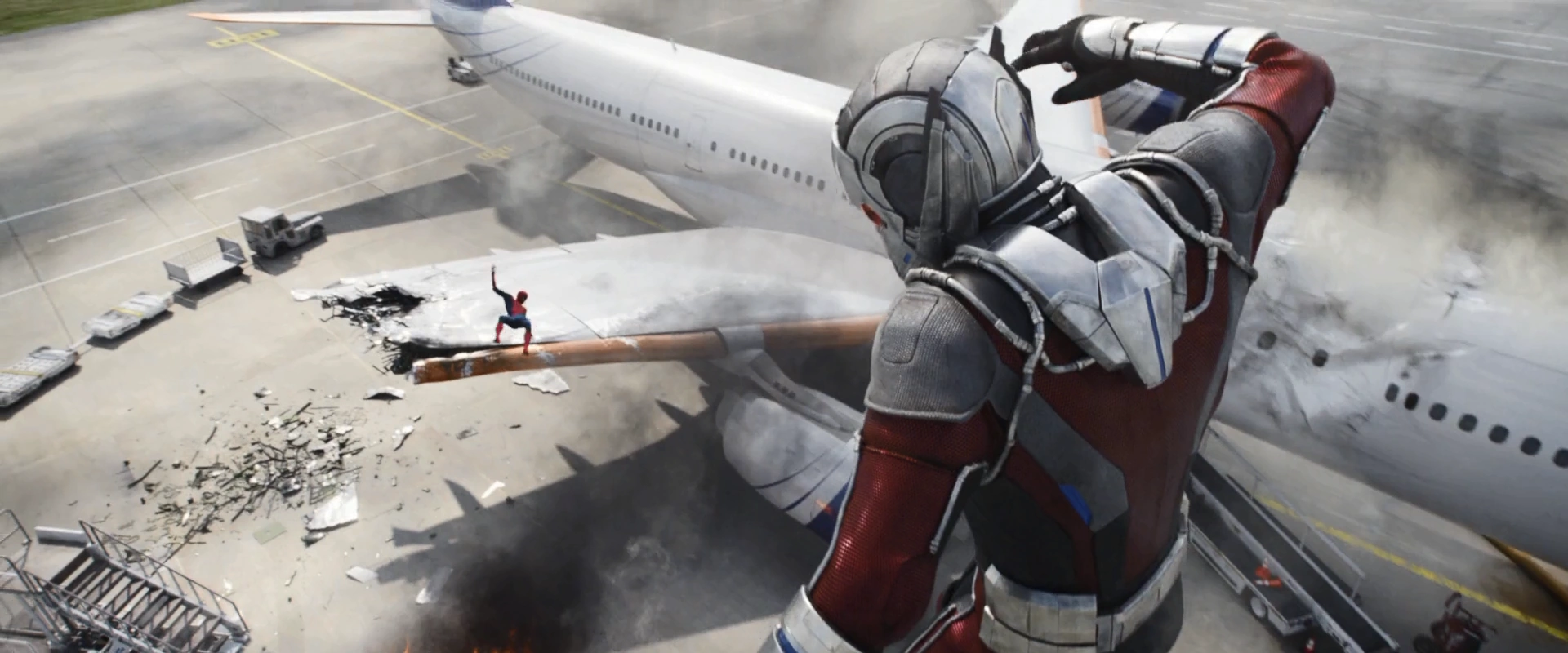 Старк и его команда, теперь уже с Человеком-пауком, используя новый костюм, сделанный Старком, противостоят Капитану Америке и его команде в аэропорту.[1]Питер Паркер, тем временем, снимает фильмы из укрытия за грузовиком, указывая на всех героев, которых он наконец встретил. Когда Старк призывает его, он кладет свой телефон, когда он переворачивается в конфронтацию и крадёт Щит Капитана Америки.[2]