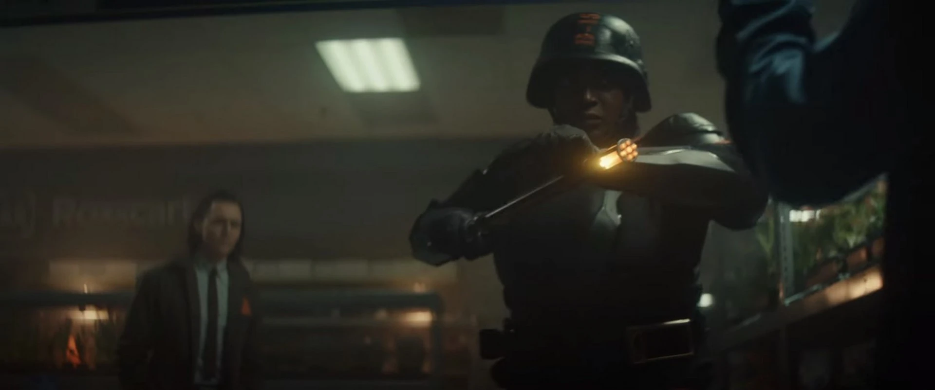 Затем B-15 и Локи начали рыскать по проходам в поисках зарядов перезагрузки или Варианта Локи и ничего не сказали друг другу. Когда Локи попытался заговорить, B-15 велела ему замолчать, прежде чем она услышала подозрительный шум. Тихо повернув за угол, она нашла мужчину в проходе с растениями, очевидно, делающего покупки. Она наставила на него своё оружие, и он поднял руки вверх. Когда его спросили, почему он покупает растения во время урагана, он сказал, что сейчас просто огромные скидок. Она спросила Локи, может ли этот мужчина быть вариантом, на что Локи ответил, что, хотя он бы надевал костюм, это всё ещё возможно. Затем B-15 подошла к мужчине, чтобы обыскать его, и он схватил её за руку, передав ей зеленую магию, прежде чем мужчина быстро потерял сознание.[8]