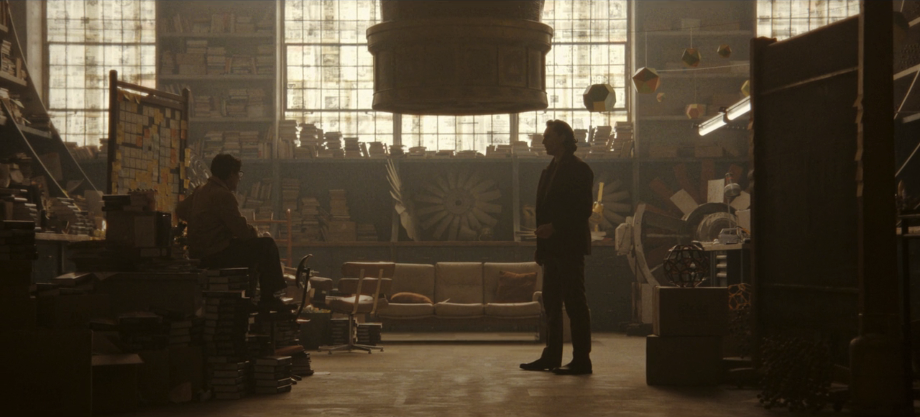 Frustrated, Loki tries to find a solution in equations, but gets interrupted when Doug shocks him with a taser and concludes that pain does not set his time slipping off. He then sacres him, which also fails. Loki then tells him to forget about time slipping and wants to learn the science way. Doug claims that the TVA could maybe does exist, but in a different time. Doug demonstrates by giving Loki a mug and putting pens in it, showing that if he were to get back to the TVA, he would have to have everyone who was at the destruction back in the same room together.[2][3]