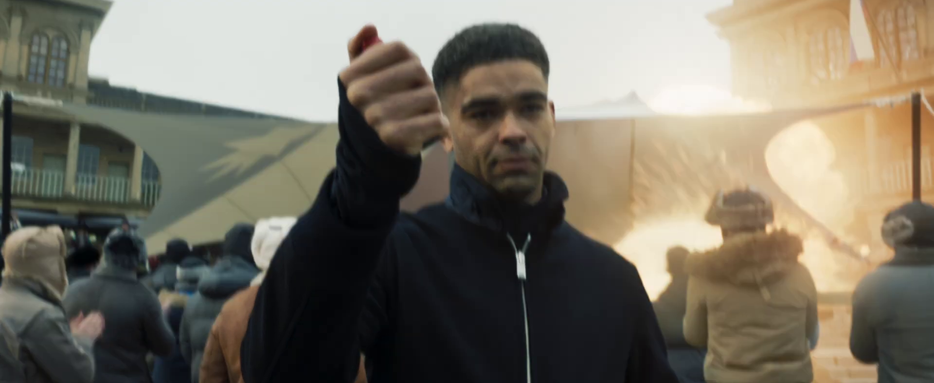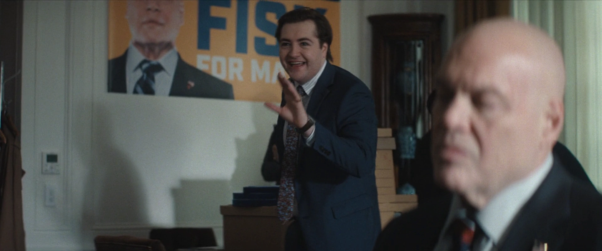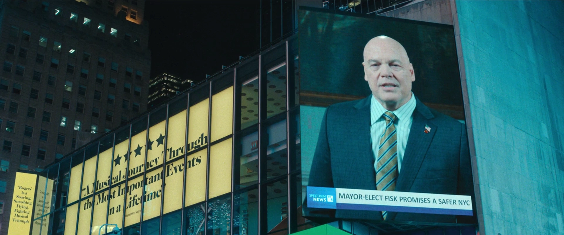 Wilson Fisk prepares to deliver a speech from the mayor's office to celebrate the New Year. Once live, Fisk offers his regards to the audience watching and celebrating New Year, and notes on how it will be a new era for New York City once he officially takes office next year as his presence is met with mixed reaction by the celebrants in Times Square.[26][9]