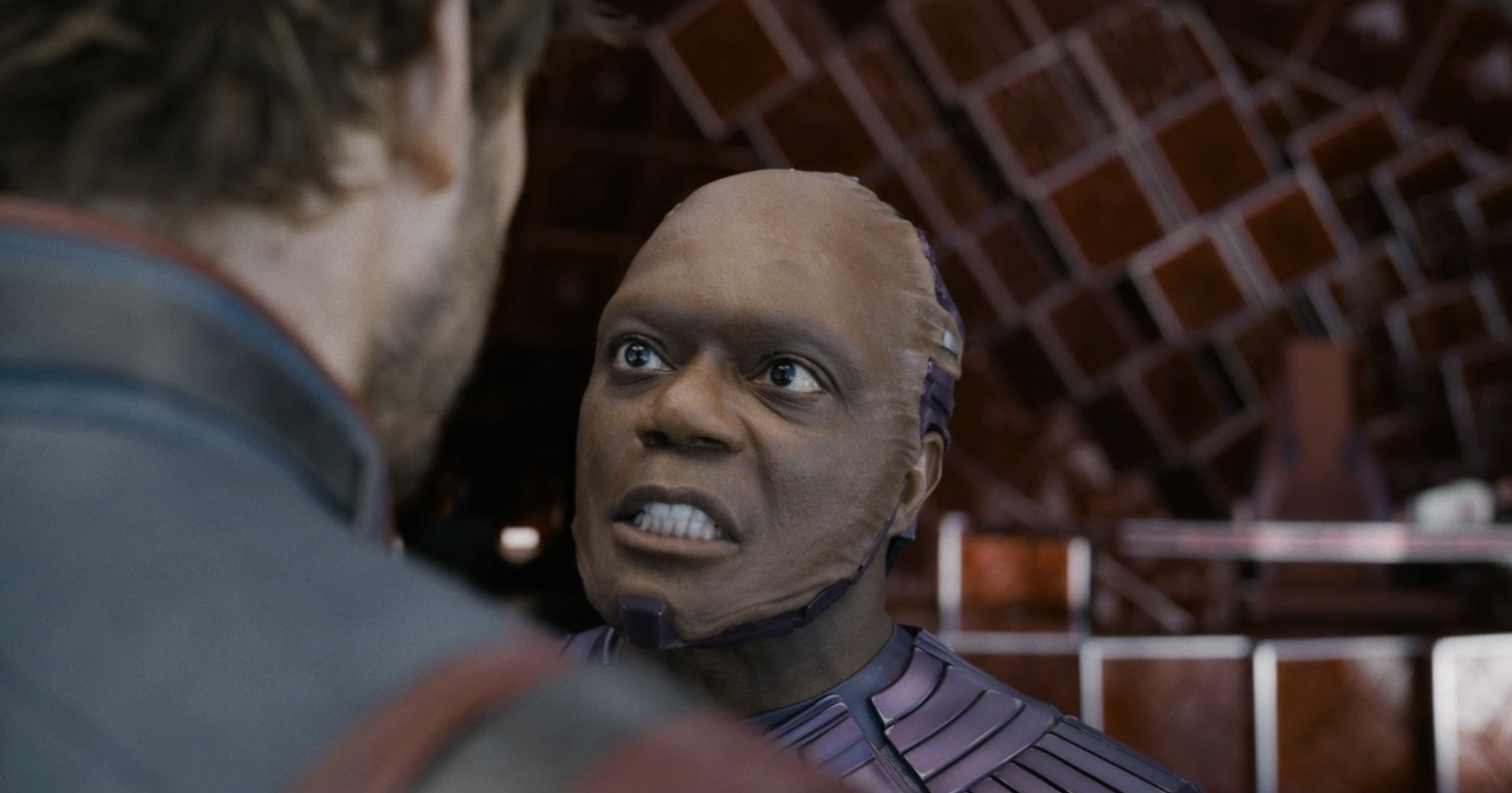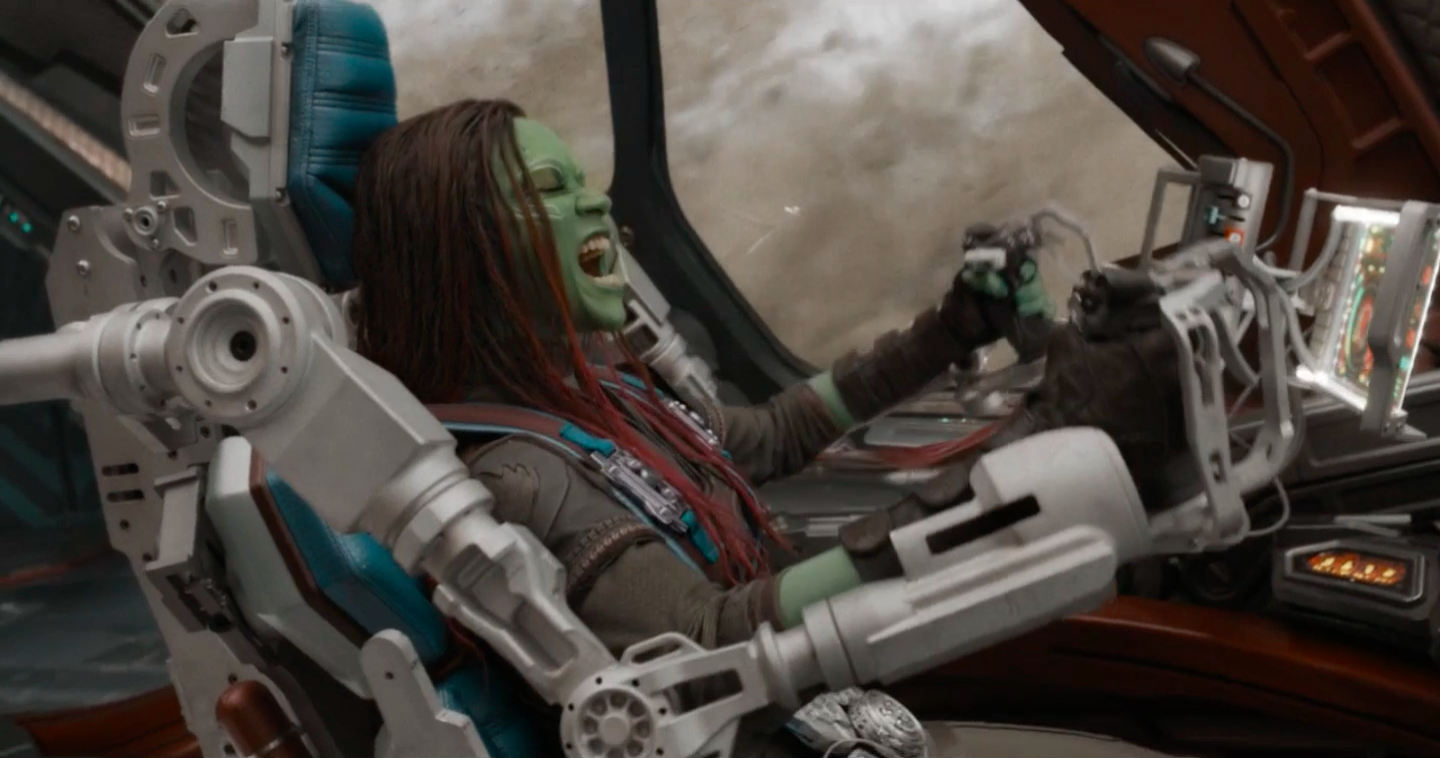 Obfonteri once again tries and fails to use his Yaka Arrow to hit a series of targets. In order to show him how its done, Cosmo uses her telekinesis to hit the targets. Upset, Kraglin calls her a bad dog, offending Cosmo. Kraglin and Cosmo join the other Guardians as they discuss Quill's mental state following Gamora's death. Nebula, however, reminds them that an alternate Gamora is still alive. Rocket suggests that Mantis use her powers, but Mantis says it is immoral.[14][16]