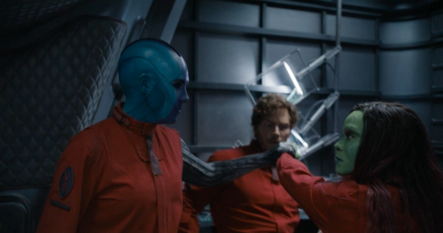 Quill, half-asleep, grabs Nebula's arm and tells Gamora that he loves her. Nebula leaves his room and is met by Rocket, who is on the ceiling, asking what she will do about Quill, saying he cannot do anything himself due to his emotional issues. Nebula asks why he is on the ceiling, so Rocket explains he is testing his Gravity Boots.[14][16]