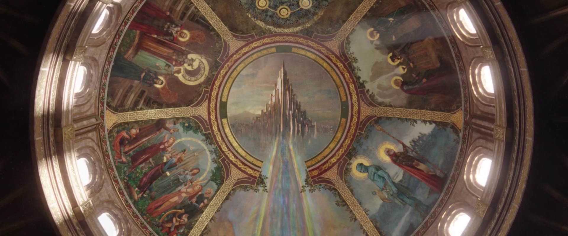 The city of Asgard is now a collection of elaborate buildings and intricate spires. Seemingly built into the rock, large structures with sweeping terraces top many of the cliffs; gleaming pyramids, statues, and columns surround Odin's palace - Valhalla, a many-tiered structure resembling a towering pipe organ - at the center of the city. Another notable feature in Asgard is the Bifrost Bridge, which provides passage to all the Nine Realms, but can only be opened if permitted by its guardian, Heimdall. It also includes Odin's Vault which contains many powerful and ancient artifacts, including the Casket of Ancient Winters, which was nearly in possession of the Frost Giants again with the help of Loki.[3] Additionally, it is where the Hall of Asgard, where all important public events take place presided over by Odin, is located; colorful ceremonial banners of the Nine Realms adorn the vast chamber during celebrations, in which the hall is crowded with Aesir and representatives from across Yggdrasil. This was also where Thor's coronation took place. It was severely damaged by the latest Dark Elf attack in 2013.[1]