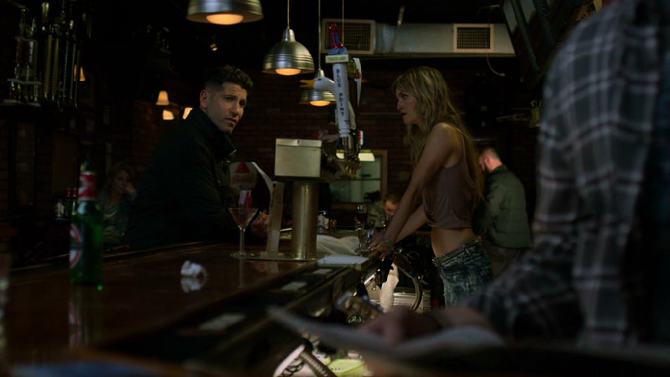 Searching for Jigsaw, the Punisher went into Tipsy Tilly's Bar after taking one of the crew member's phone to track down Lanie. Once the Punisher found Lanie, he asked her if they know the location of the crew but was uninterested in the situation until he brought Moke's thumb to unlock the phone and showed the location in case she could give in. Lanie stated her reason of going to the crew's hideout was from Tony's recommendation gave a description of the crew and where they located, leading the Punisher to thank her for her cooperation and set the severed thumb inside a shot glass.