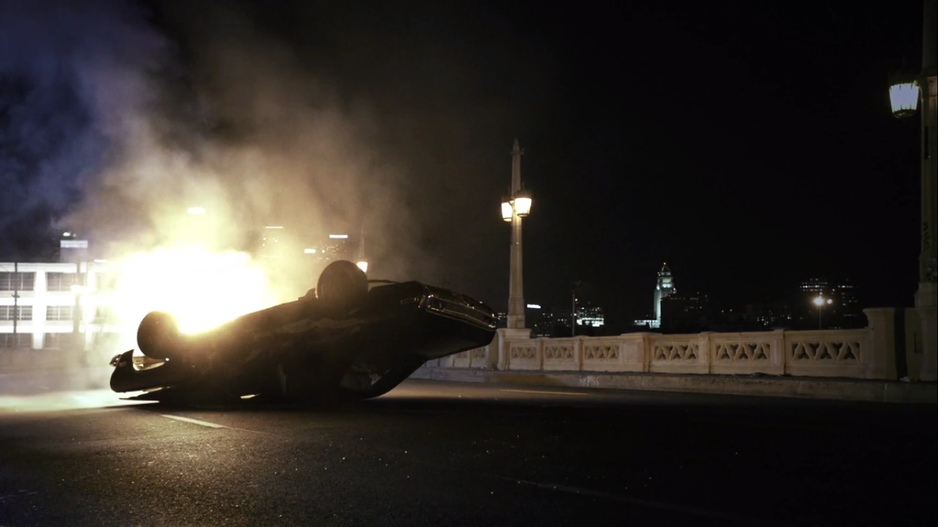The gangsters passed them and stopped in front of them at a red light. The Fifth Street Locos threw a molotov cocktail at them, setting their car on fire. Robbie put the car in reverse to get away from the van. A second car chased them, pulled alongside them and shot both Robbie and Gabe. Robbie lost control of the car and crashed in the middle of the freeway, flipping the car.