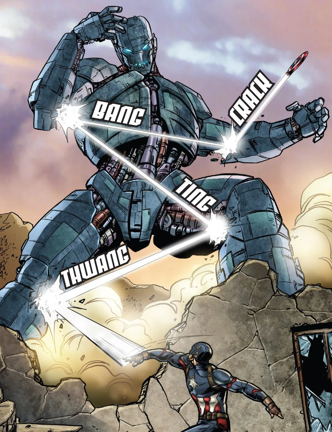 Rogers had Sam Wilson determine that the robot was being controlled remotely, rather than by Artificial Intelligence. Wilson and Natasha Romanoff left to deal with the Hydra agents controlling it, while Vision destroyed the camera providing video feed to Hydra. While Romanoff and Wilson fought the soldiers, Vision and Rhodes fired at Ultimo, while Maximoff used her powers to destroy the robot, channeling her anger at Ultron regarding her brother's death.[3]