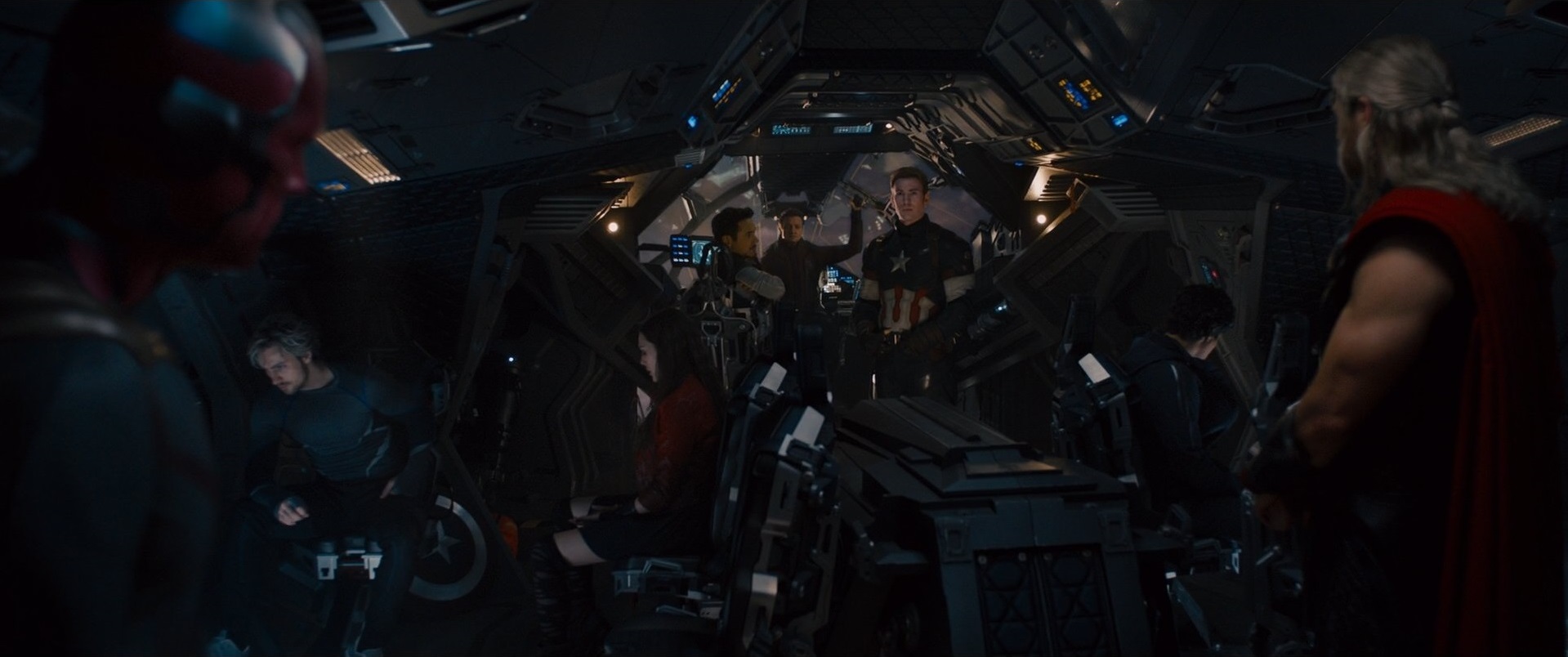 Rogers and Stark brought Loki onboard the Quinjet and they flew back to the Helicarrier for questioning. On the way, Rogers and Stark discussed Loki's suspicious surrender, as well as each other. Not too long after, the Quinjet was infiltrated by Thor, who grabbed Loki and flew away. Stark then went after him, and Rogers followed after equipping a parachute, despite Romanoff's warnings about the Asgardians.