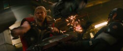 When Iron Man found Thor, the two argued over taking Loki. Both of them refused the other's requests, so a fight broke out between them. During the fight, Captain America intervened and tried to talk with Thor. However, this did not last long, as Thor went to attack Captain America, too. Although, when Thor struck Captain America's Shield with Mjølnir, it caused a shockwave to go off, knocking everyone down. The three then decided to no longer fight and return to the Helicarrier.[8]