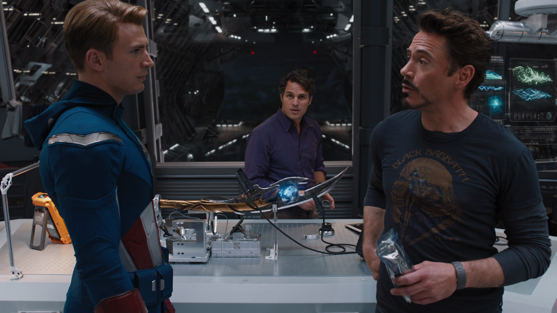 As Stark and Banner examined the Scepter and began their search, they bonded with each other. When Steve Rogers arrived and found Stark testing Banner's control over his transformation, the three discussed Fury calling them in, believing he was hiding something. After discussing Fury's motivations, a dispute broke out between Stark and Rogers, as the latter believed they should stay focused on the mission, whereas Stark was attempting to uncover S.H.I.E.L.D.'s secrets.
