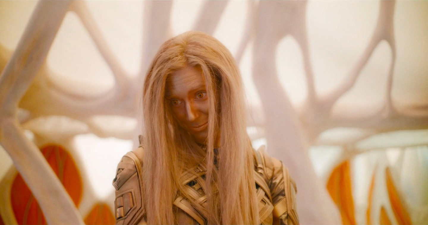 When it was reported that the Guardians of the Galaxy infiltrated the Orgoscope, Ayesha and Adam went to the biological planet. Upon arrival, Ayesha picked up a Ravager outside of the Orgoscope for interrogation. She sat Fitz-Gibbonok down with his pet, Blurp. They then tried to interrogate Fitz-Gibbonok, who would not talk. Ayesha told Adam to show him they meant business.