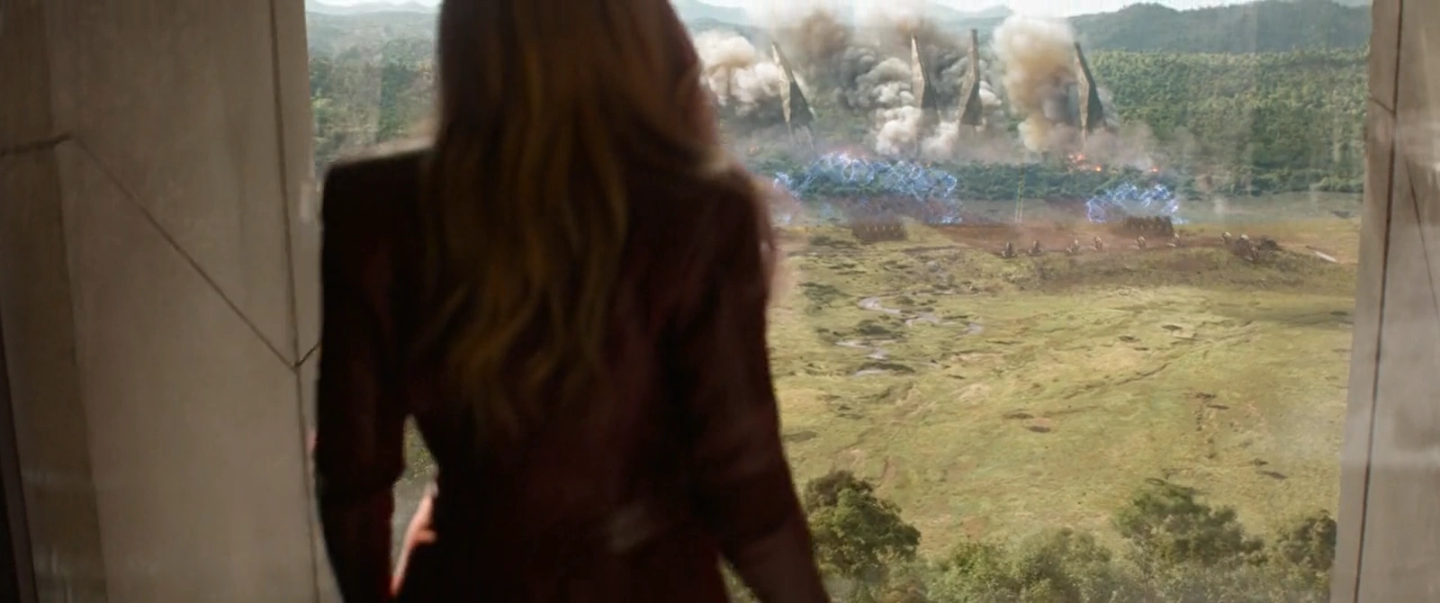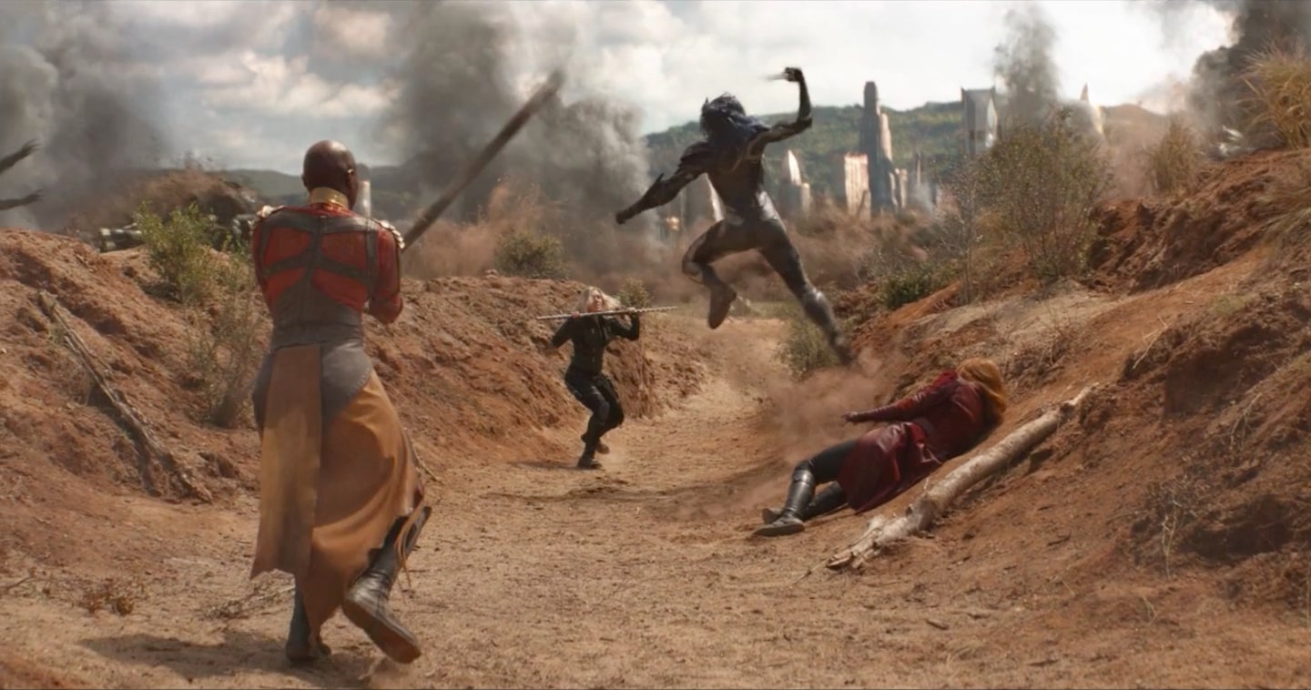 To further turn the tide back in their favour, the Outrider dropships suddenly released a force of Threshers. Burrowing underneath the Wakandan barrier, the Threshers wreaked havoc across the Wakandan army, forcing T'Challa to order a retreat. Observing from Shuri's lab, Wanda Maximoff realized that her allies were outmatched once again. Abandoning her post in the lab to assist on the battlefield, Maximoff used her powers to disable a wave of Threshers, rescuing Black Widow and Okoye before throwing the Threshers into numerous Outriders, crushing them instantly.