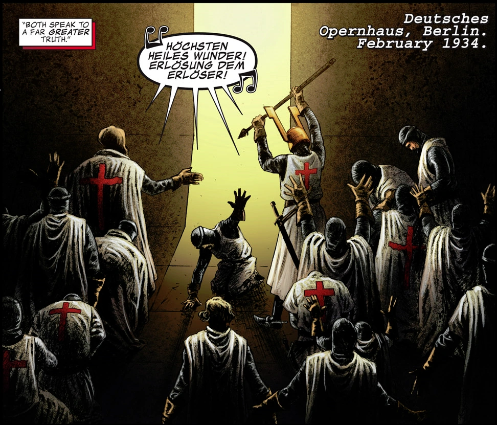 In February 1934, Adolf Hitler attended a representation of Richard Wagner's opera Parsifal at the Deutsches Opernhaus in Berlin. During the ensuing gala dinner, Hitler praised some aspects of the play that linked to his own line of thought, such as celebrating the purity of blood that must be safeguarded, while constructing a new aristocracy based on it.