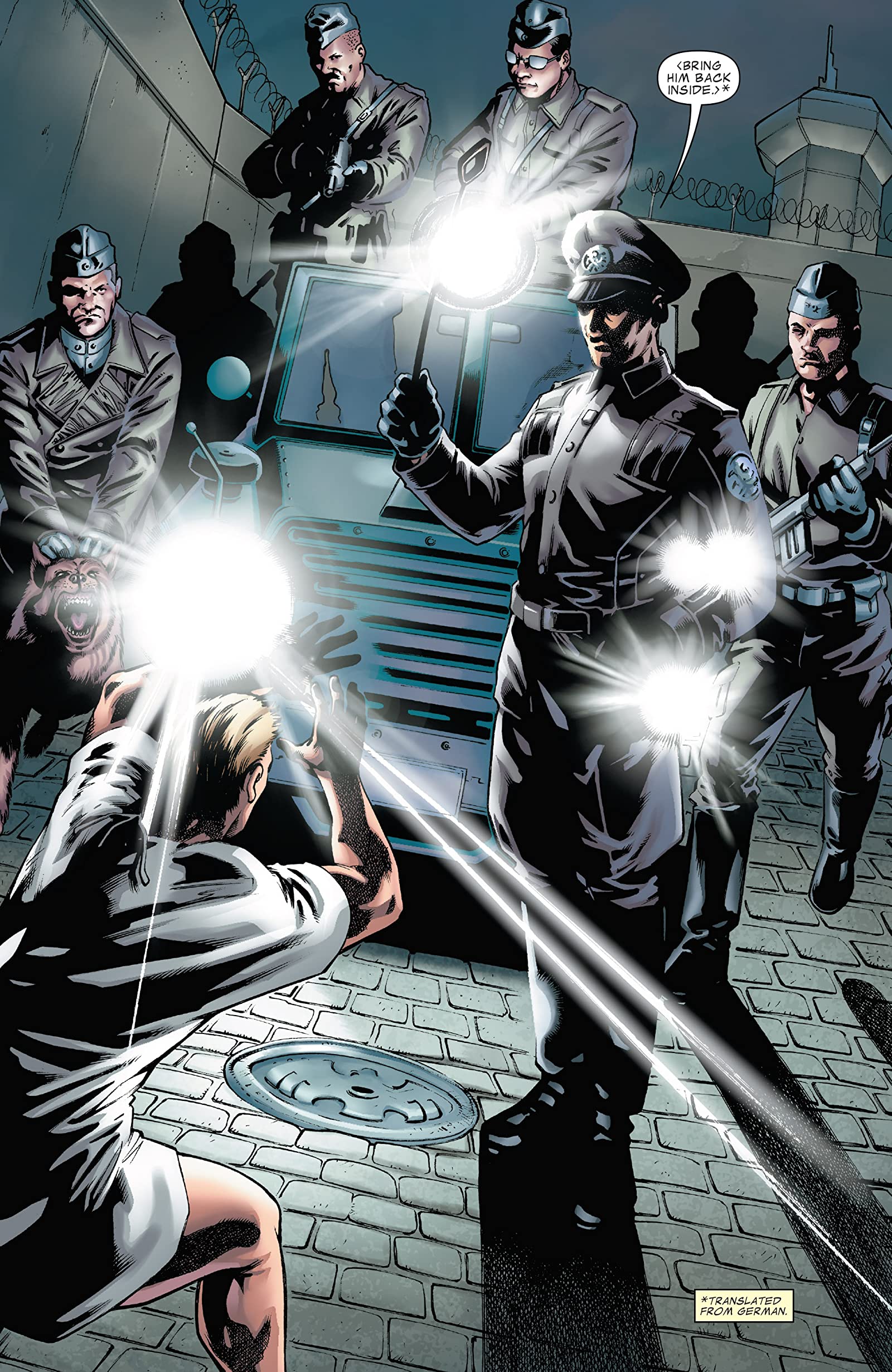 The Soviet patrol led by a Hydra officer on the streets of East Berlin