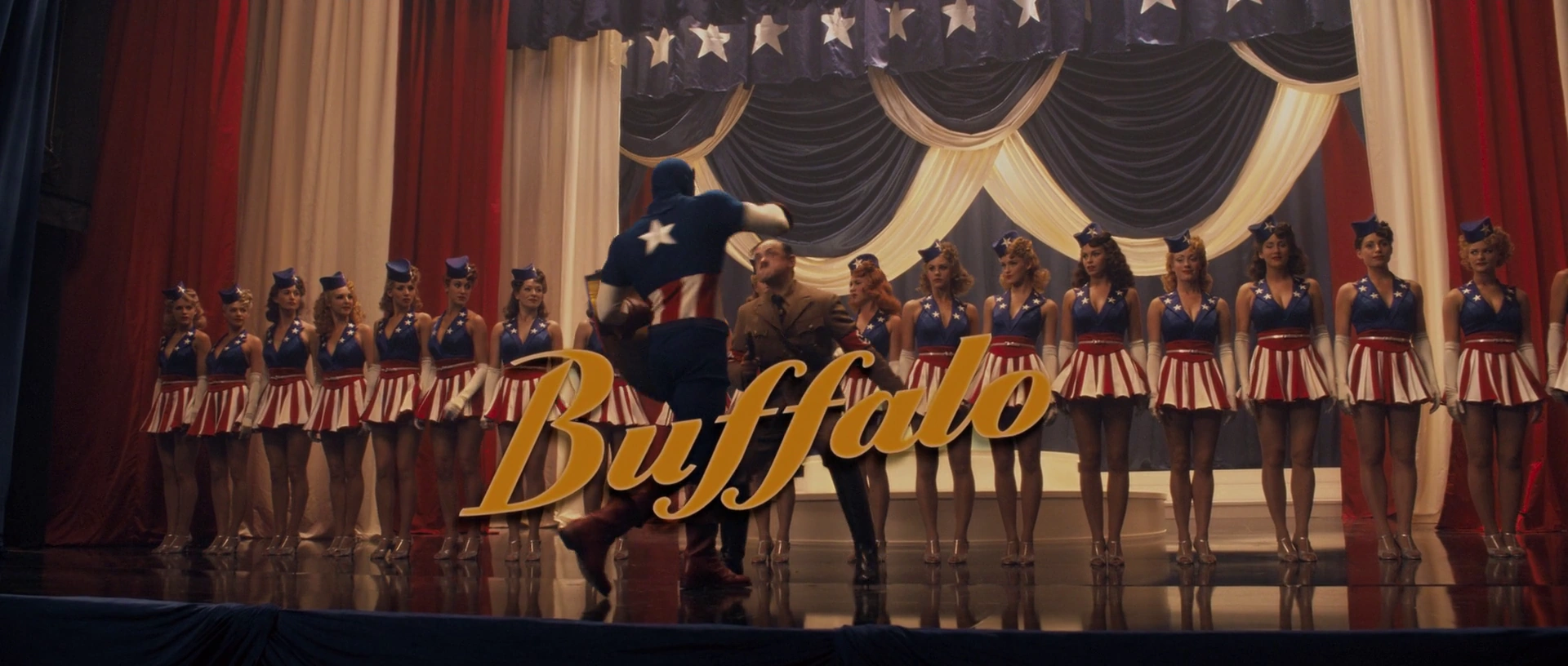 In an alternate universe, Steve Rogers performed in one of his USO shows in Buffalo, but tripped onstage as the Star Spangled Singers tried to pull him into their dance.[2]