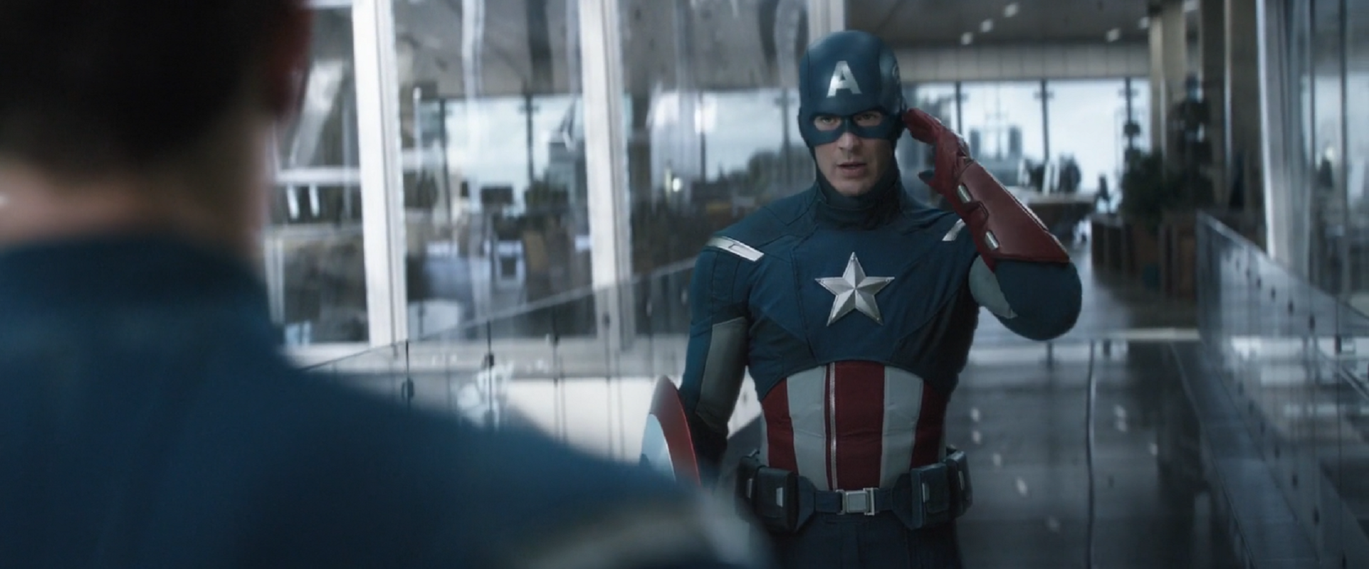 Captain America reported that he had found Loki, but the other Captain America tried to explain he wasn't Loki. Refusing to believe what he was saying, Captain America then attack him, and the two began to fight, soon losing both of their shields. They then fought hand to hand, which was fairly even, until they both slipped, falling fourteen floors. As they got up, Captain America noticed his compass drop from "Loki," so he asked where he got it, but he attempted to grab the Scepter, so they continued fighting.
