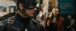 Due to his focus being on retrieving the Scepter, Captain America was able to overpower him and get him in a headlock. However, the other Captain America told him that Bucky Barnes is alive, causing him to become distracted, and letting go of his grip. The other Captain America then took this chance to grab the Scepter and use it on him, causing him to become unconscious and have his memory of this wiped.[11]