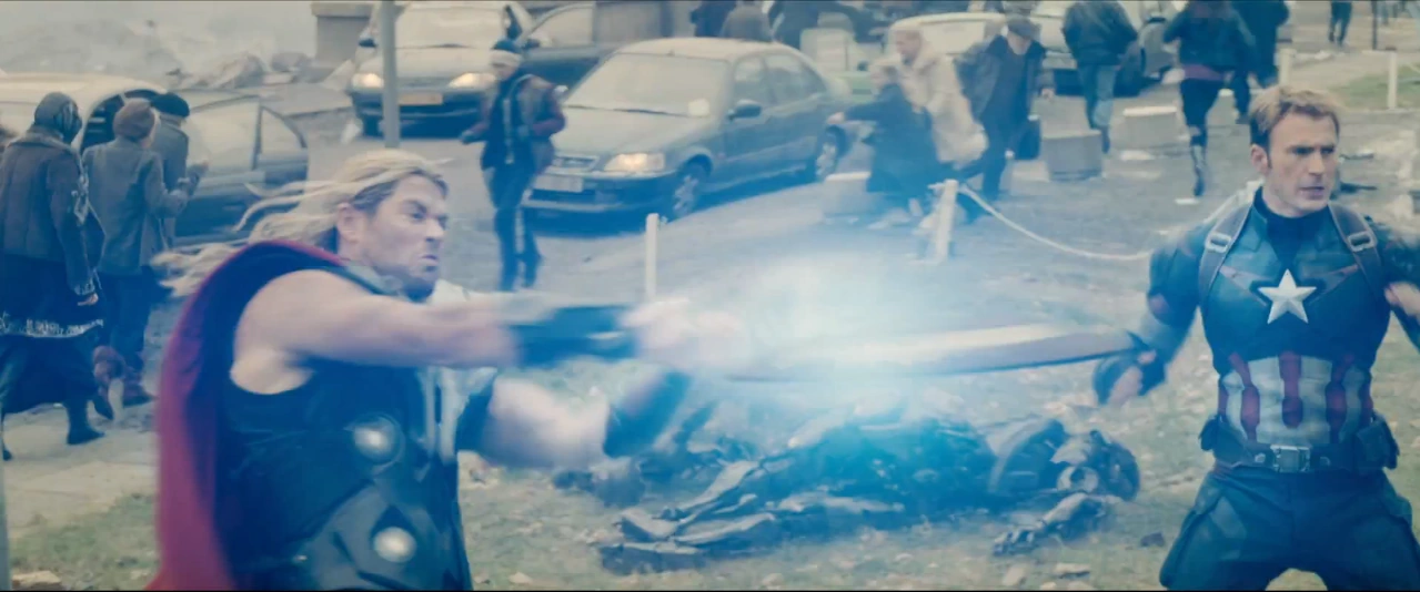 During the Avengers' Attack on the HYDRA Research Base, Rogers and Thor noticed that the HYDRA soldiers were in a particular formation approaching them. Rogers held up his shield and allowed Thor to hit it with Mjølnir; the resulting shockwave caused the operatives to be rendered unconscious.