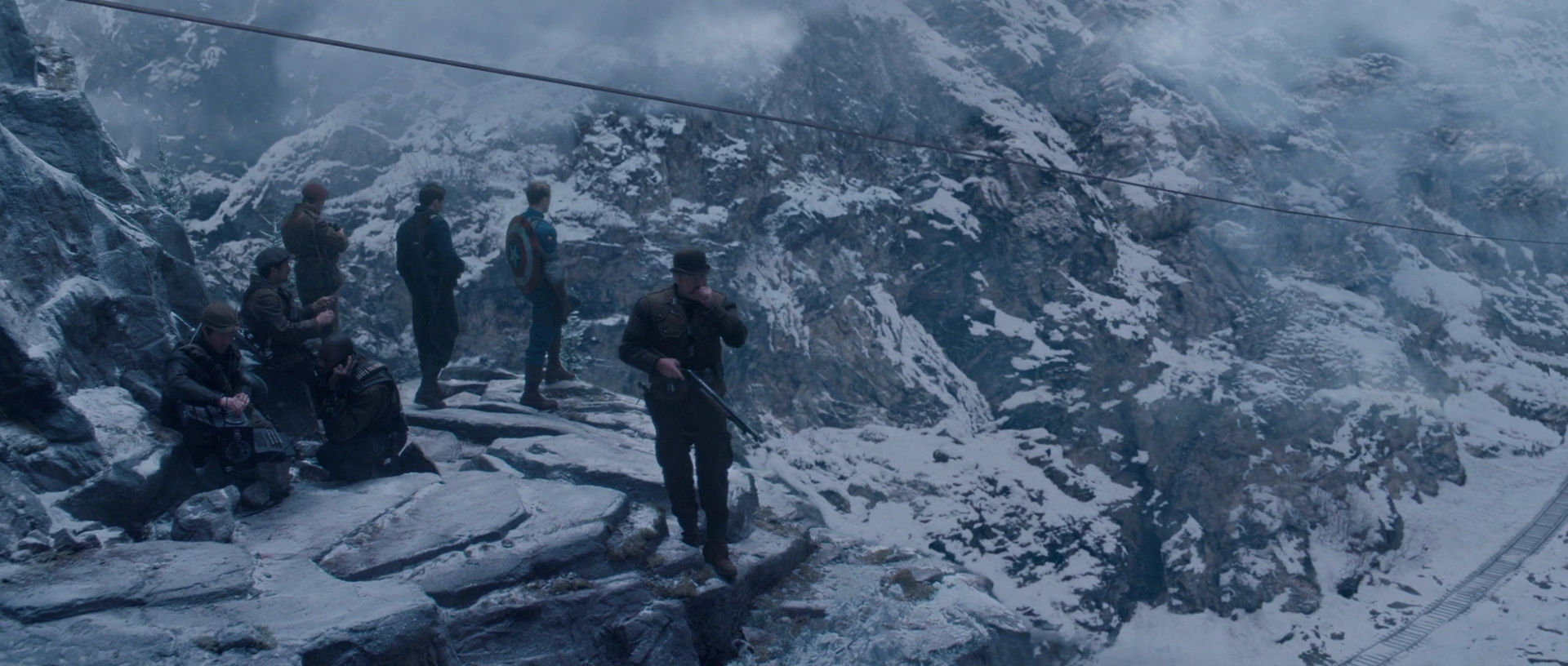 Having calculated where the armored train would be, the Howling Commandos posted up on a nearby cliff overlooking the tracks as Gabe Jones confirmed that Zola was a passenger. The Commandos set up a zip-line from the cliff to the mountainside on which the tracks ran, allowing them to travel safely over a deep valley. One by one, Captain America, Bucky Barnes, and Jones slid over the valley and landed on top of the train as it passed by, with Jacques Dernier calling out when each member of the assault team should begin their jump. The other Howling Commandos stayed behind, acting as overwatch for the now-in-progress mission.