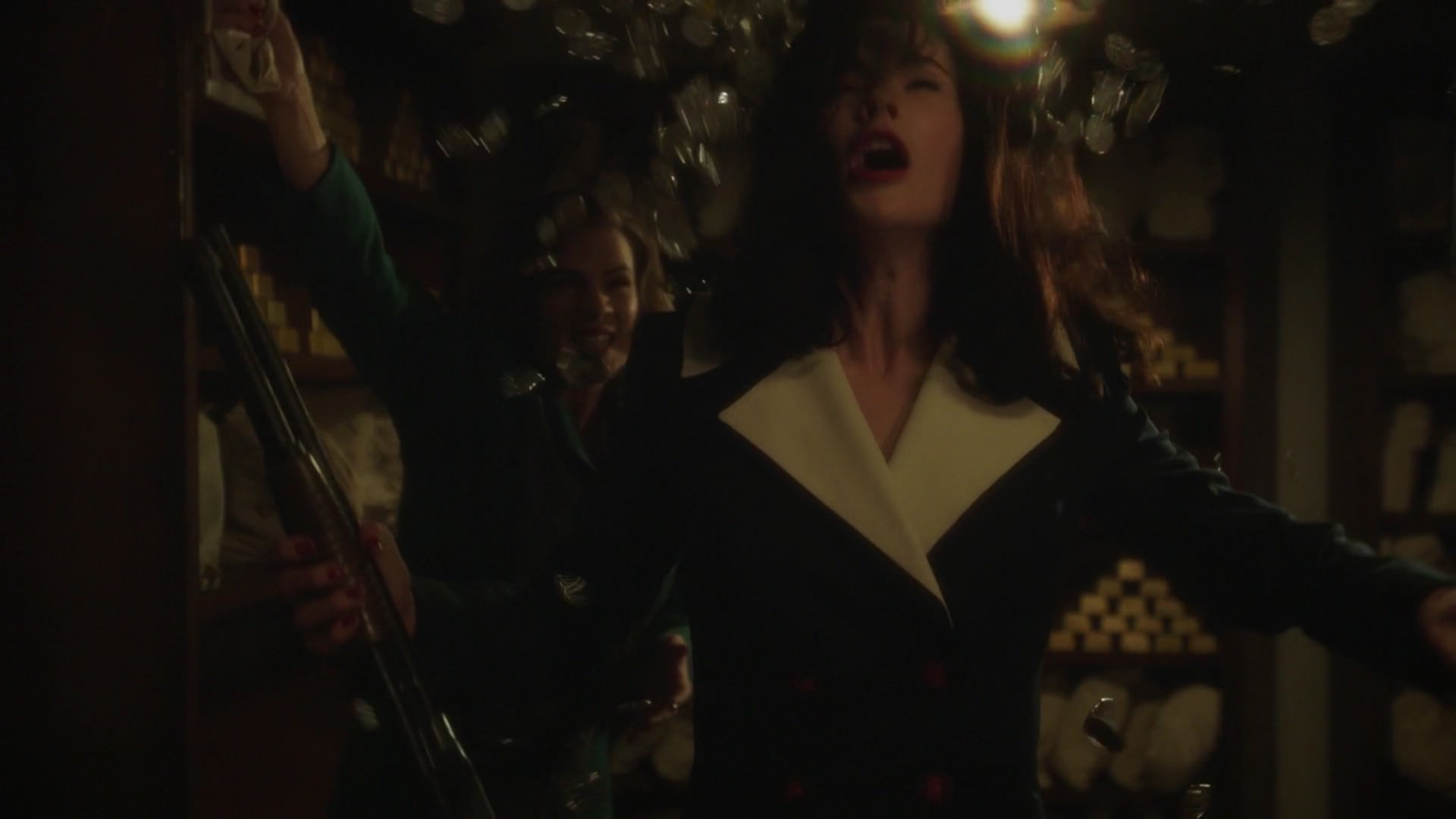 Once Carter revealed herself, Jack Thompson signaled for SSR agents pull out their gun and to surround Underwood's men at gunpoint; Thompson loved leading the other agents and constantly grabbed his hat and talked boastfully as he arrested Underwood's men, knocking one man to the ground. Carter demanded that Underwood put down her gun; however, as she did she kicked the bank teller's gun away and engaged Carter in a brutal fight. Underwood continued to mock Carter as she attempted to kill her until she was eventually knocked out when Carter struck her over the head with a bag of money. Underwood was then finally apprehended and taken into the custody.[1]