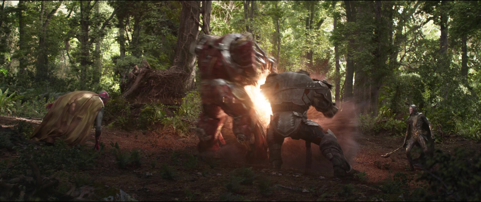 Obsidian then started to kill several members of the Border Tribe and Jabari Tribe, until he was attacked by T'Challa's kinetic energy pulse. Once Wanda Maximoff had joined the fight, Midnight ordered Glaive to take the Stone, and Obsidian took notice of the conflict and joined Glaive into attacking Vision in the nearby forest. Obsidian used his hammer to violently hit Vision, sending him deeper into the forest. Bruce Banner in his Hulkbuster armor then arrived and threatened to attack the two of them.