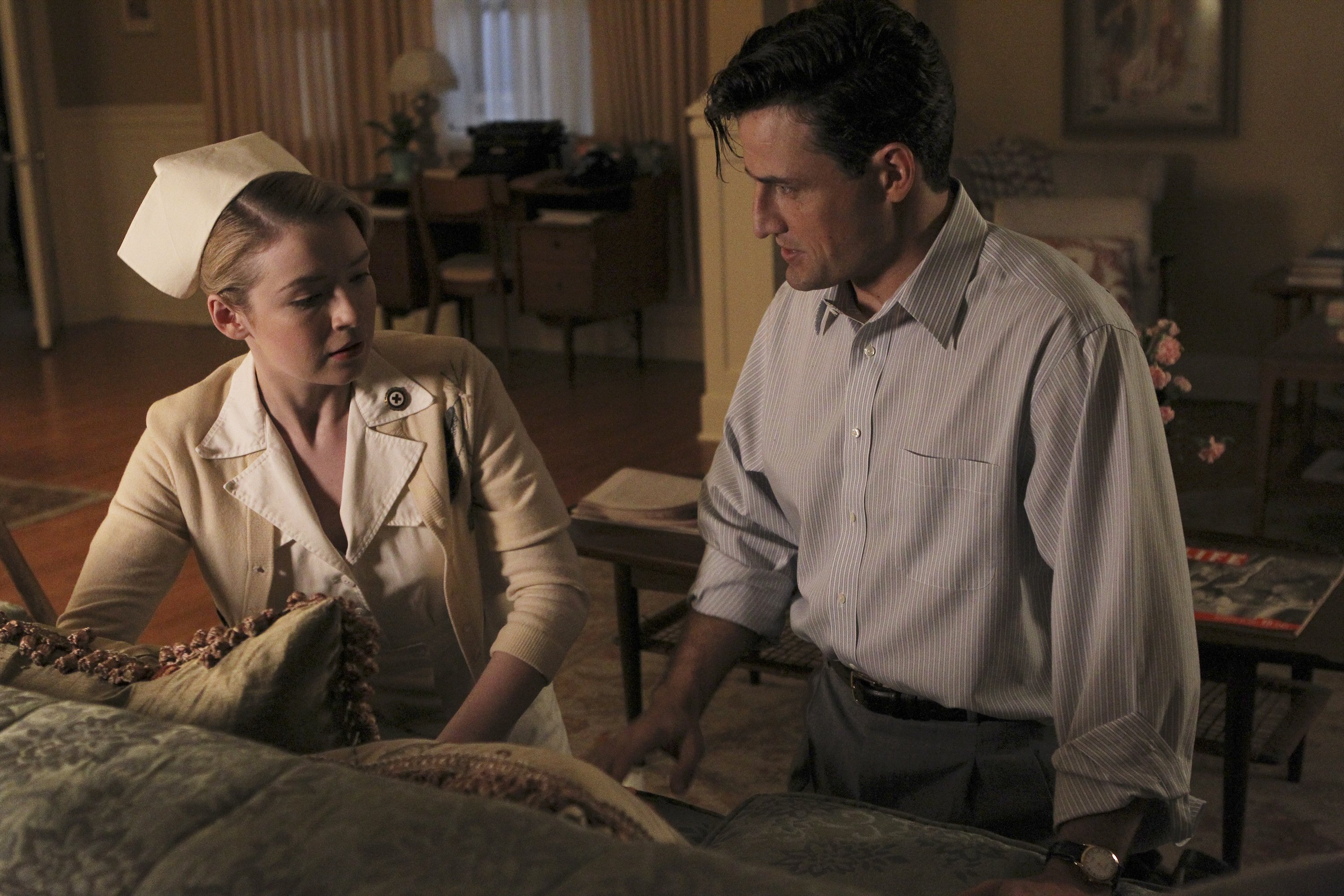 Sousa was the first to start the three-man interrogation of Peggy Carter. Each agent used different tactics in an attempt to get her to confess to being a traitor: Sousa played on their friendship; Roger Dooley showed disappointment in a fatherly fashion; Jack Thompson reminded Carter that he used fisticuffs against interviewees. Carter told Sousa that he saw her as a "girl on a pedestal transformed into the daft whore."