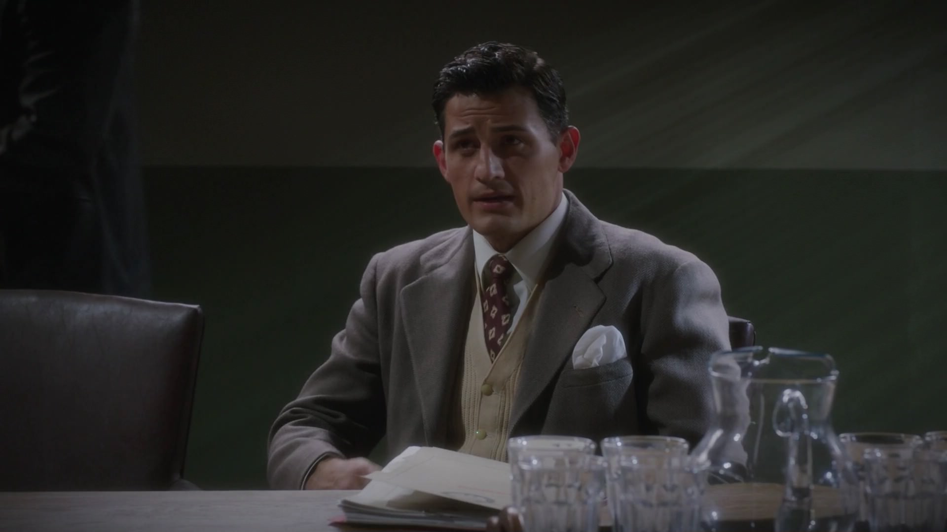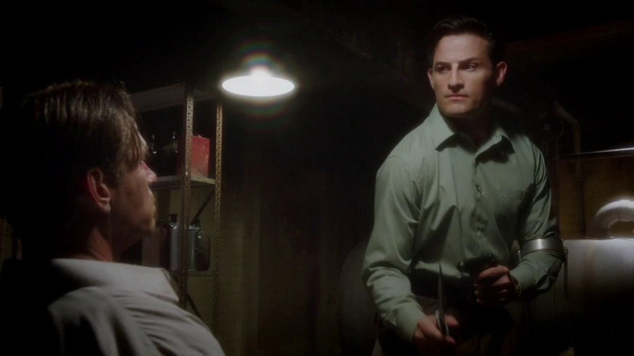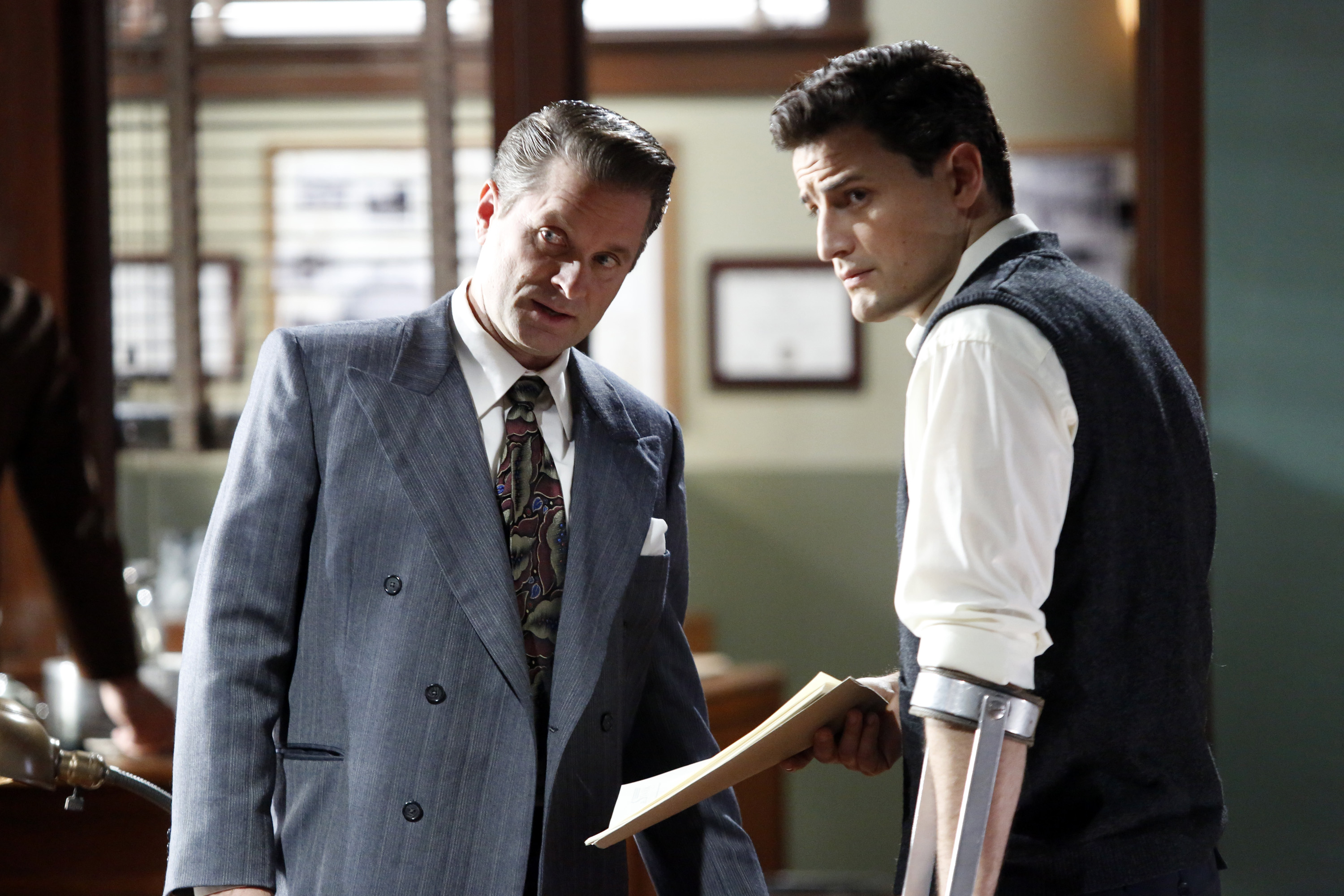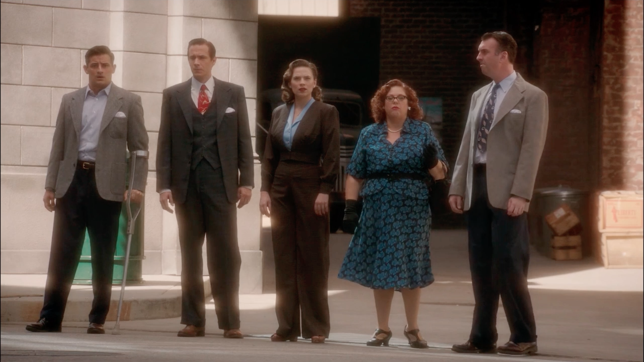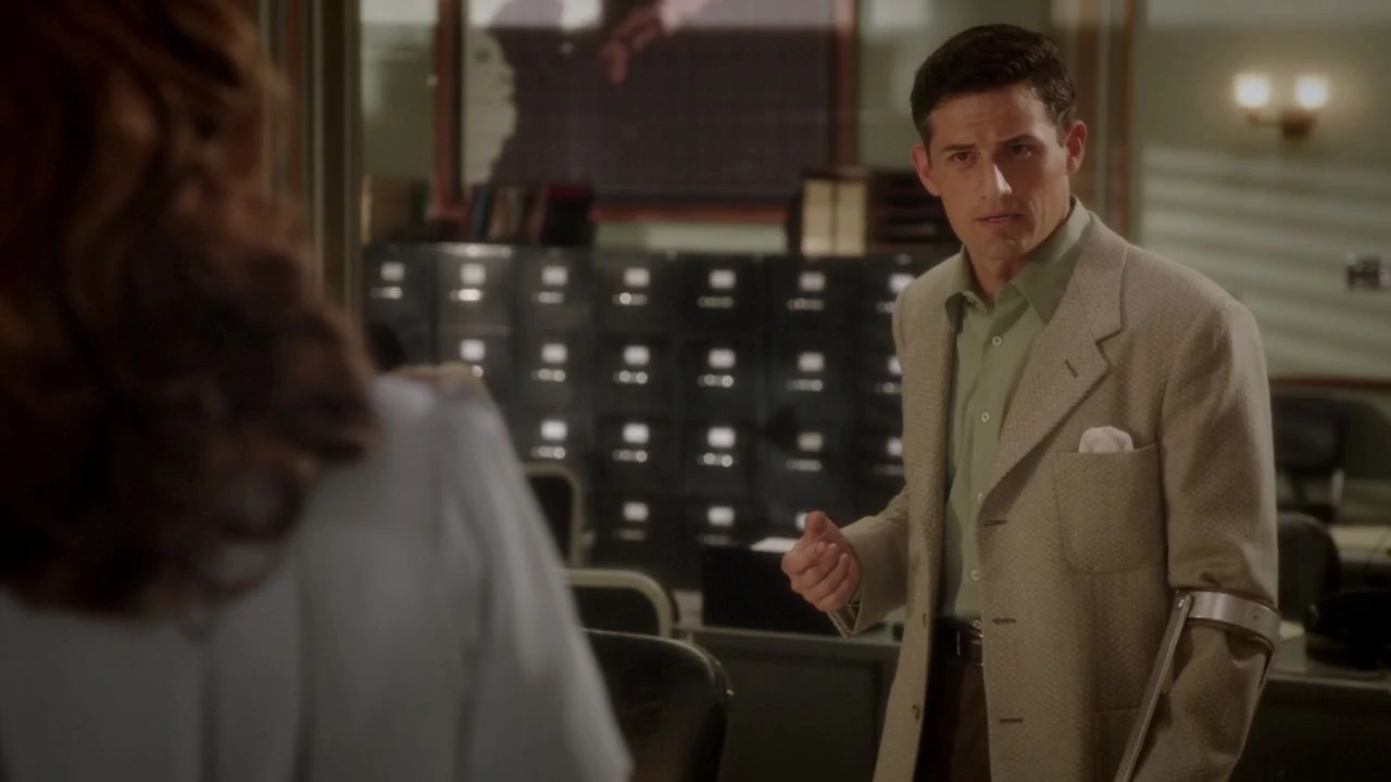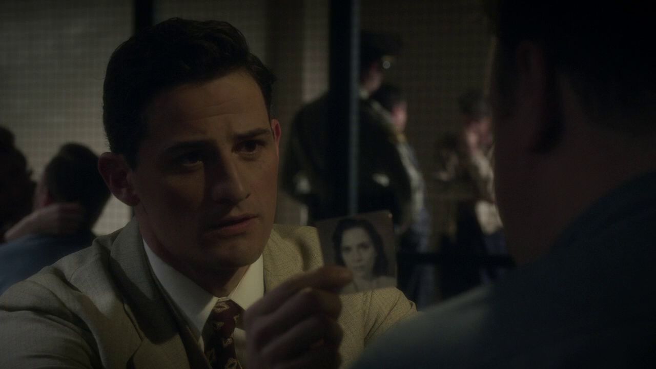 Sousa went to the jailhouse that held Sheldon McFee and showed him a picture of Peggy Carter from her personnel file. McFee positively identified Carter as the woman who assaulted him; he went further and connected Carter to Leet Brannis and the truckload of Nitramene. Sousa went to the office and interrupted a conversation that Roger Dooley was having with Viktor Ivchenko, telling Dooley that they needed to talk immediately.