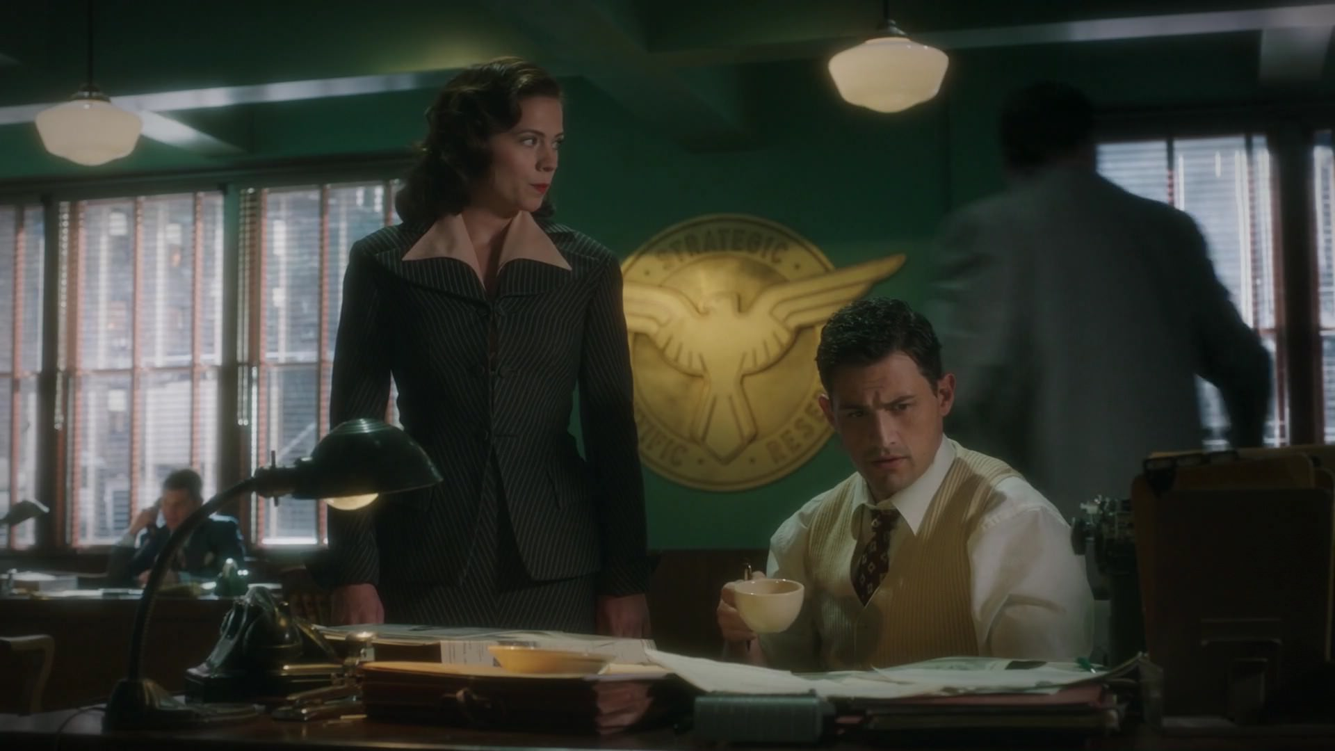 In a broom closet in the Auerbach Theatrical Agency, Sousa and Carter interrogated Hunt. Sousa attempted to negotiate with him for names, only to have Hunt mock him for his injury, saying that while Sousa had it easy during the war, he had been captured and tortured by the Japanese. Hunt told Sousa that he would never get him to talk. Sousa ceded the interrogation to Carter, watching while she injected Hunt with a fluid she claimed was a virulent strain of malaria. Carter told Hunt he had ten minutes, and that there was an antidote, but only if he gave them the information needed; she and Sousa left the room. While waiting, Sousa asked Carter what had been the fluid; she replied that it was a fast-onset cold developed by Howard Stark. Sousa stared in disbelief as Carter asked if he wanted tea.