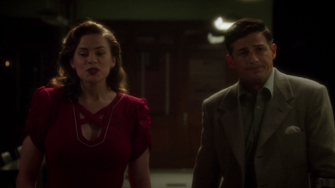At the Agency, Sousa offered backup to Carter for when she met Wilkes at the Dunbar Hotel, but she cited that the note said for her to come alone. Sousa told Carter to change into a better wardrobe since the place was a nightclub; he took Violet there once to listen to Ella Fitzgerald. Sousa decided to cancel his date to give Carter backup, but she firmly insisted that he go after accidentally discovering the engagement ring he had planned to give to Violet that night.