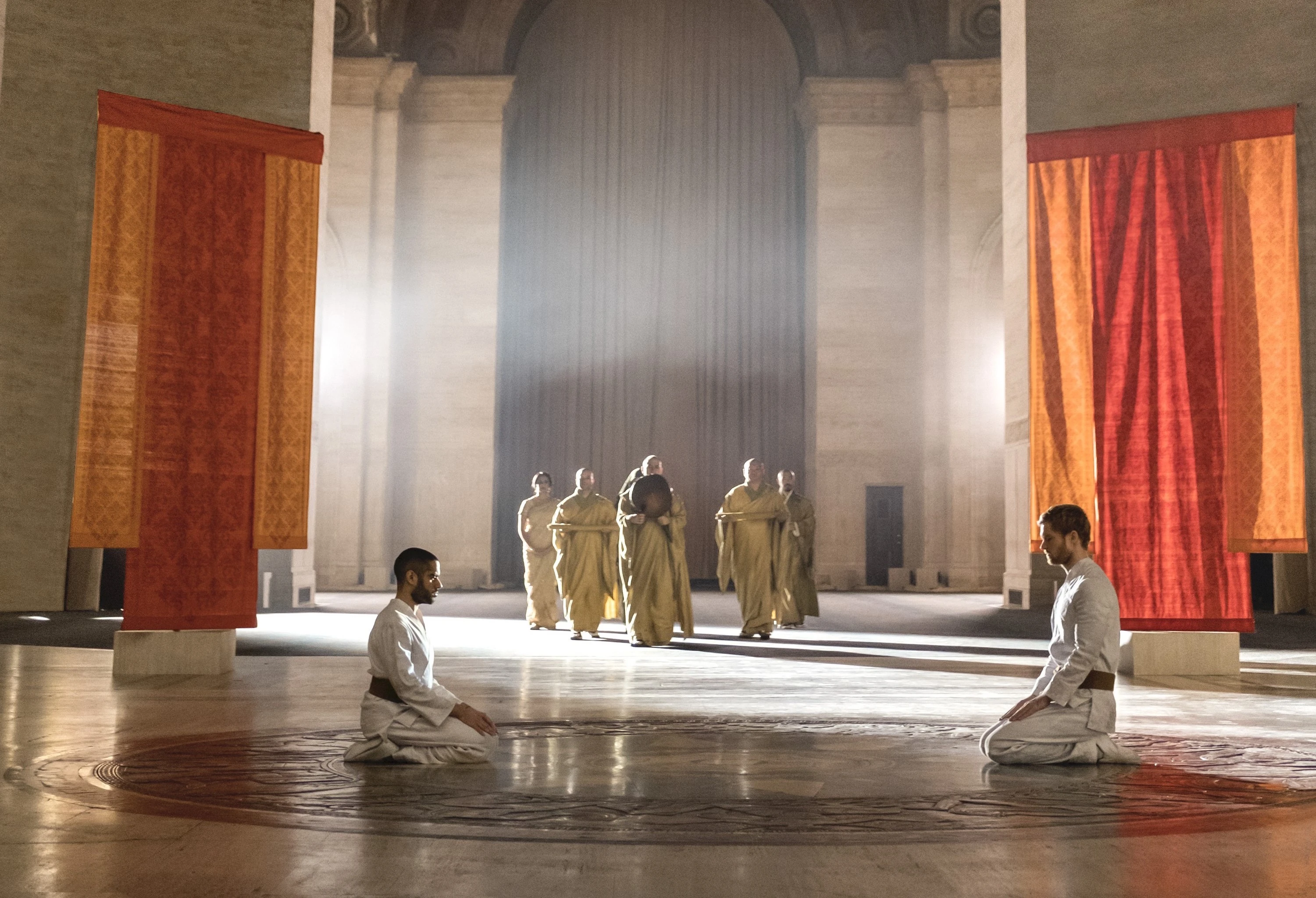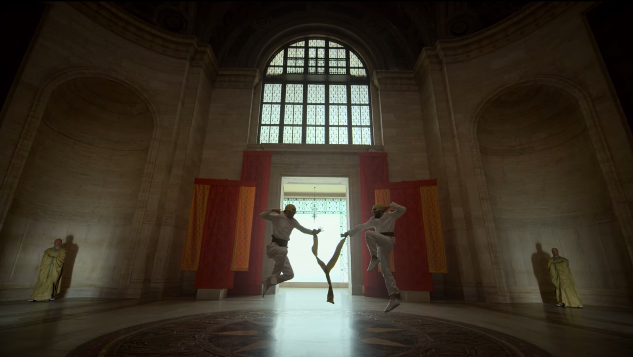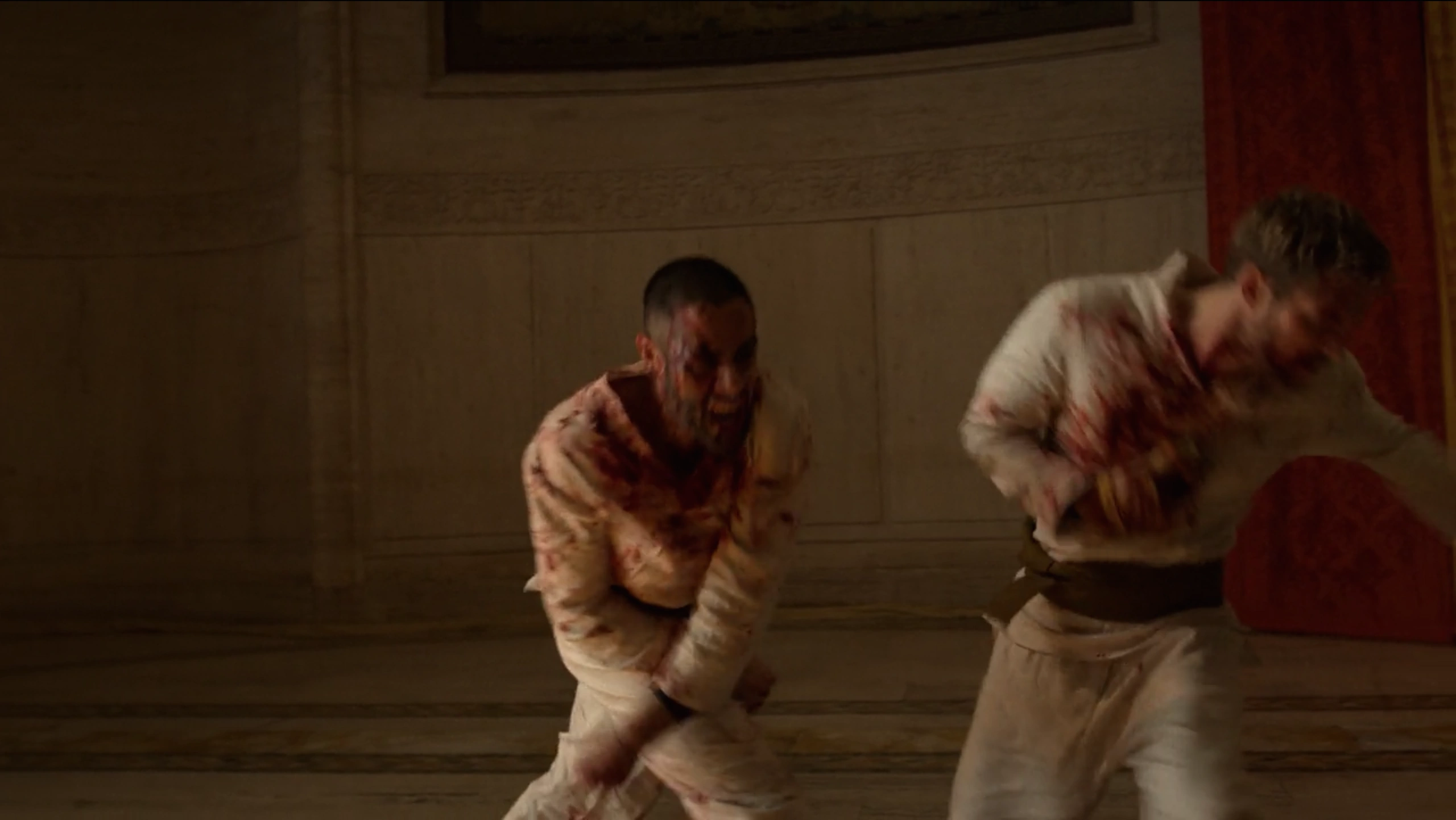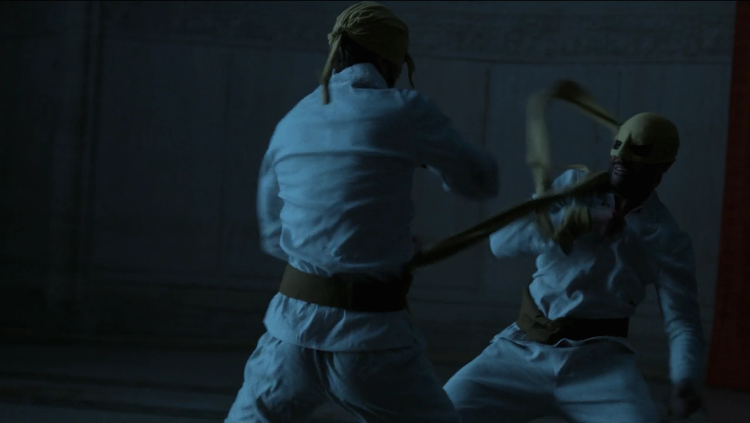 Davos and Rand had worn their traditional karate gis and were given masks as they meditated before the fight. The two friends were then tied to one another by a long piece of cloth which would make their fight more of a challenge as each could use it to their advantage as either protection or their weapon. Lei Kung explained that neither of the fighters would be allowed to leave the room until one was finally victorious, noting that their fight would only end by yield or death. Davos and Rand then circled one another, eyeing up their opponent until Kung had then finally told them to begin their fight.