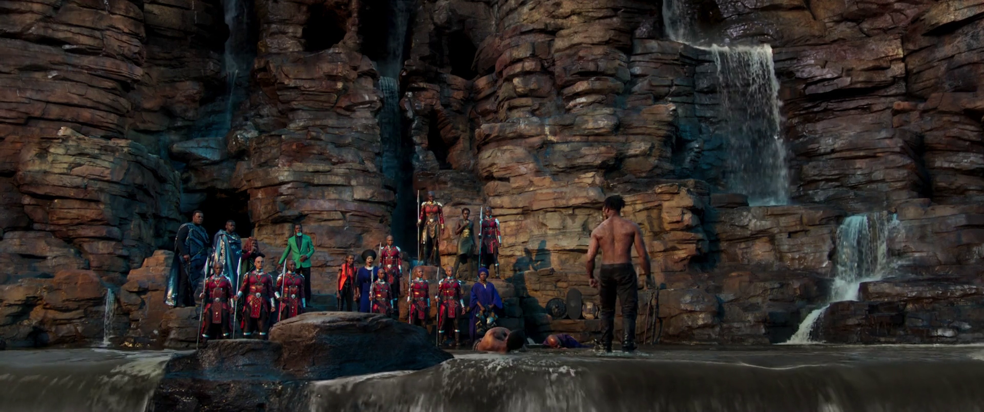 Later, as the leaders of the Wakandan Tribes and their warriors journeyed down the river to Warrior Falls, the Dora Milaje struck their spears on their riverboat, activating the drainage system for the waterfall. The falls reduced to reveals a hidden space just below the cusp of the waterfall, which allowed for the Tribal Elders to gather and visitors to bear witness. As the ceremony commenced, the Dora Milaje took their places along the edge of the Falls while Zuri asked for challengers from the Wakandan tribes to face T'Challa in ritual combat to fight for the mantles of Black Panther and King of Wakanda.
