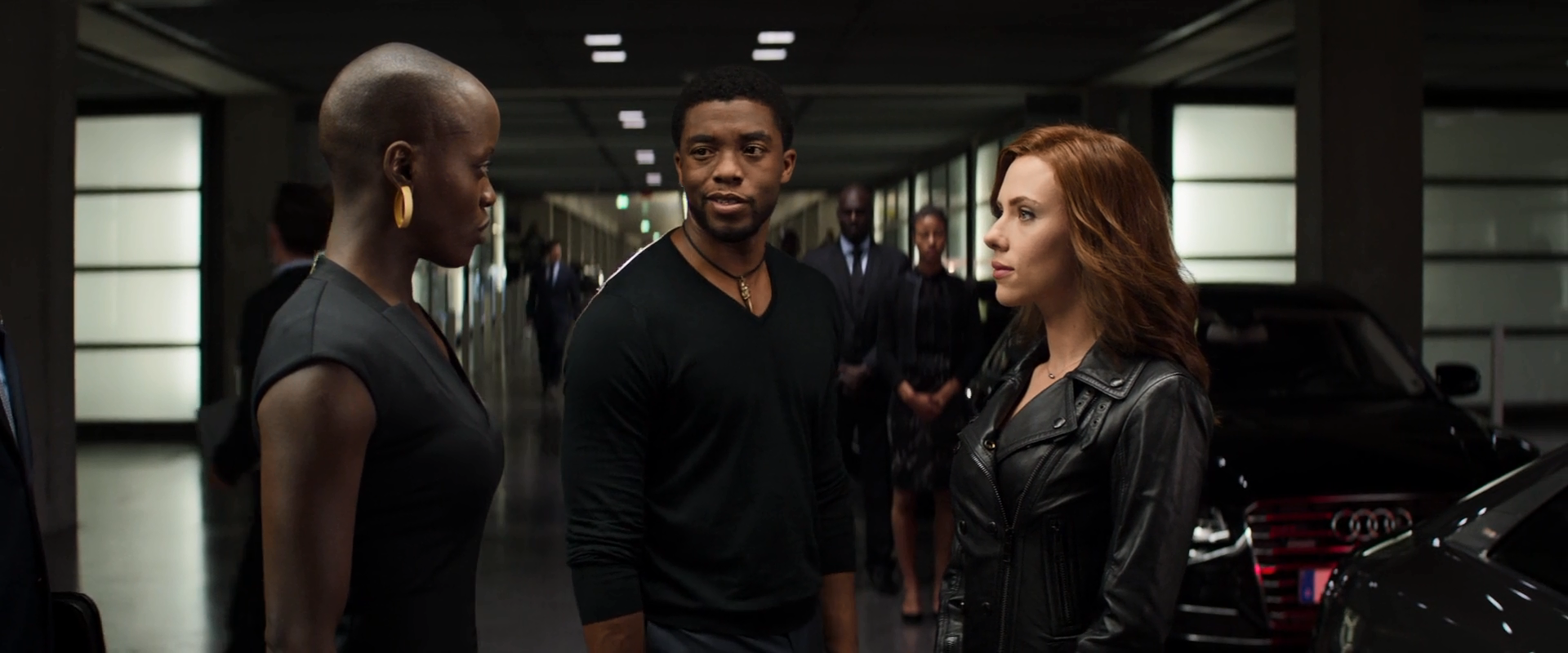 The Dora Milaje stand ready as T'Challa speaks to Killmonger