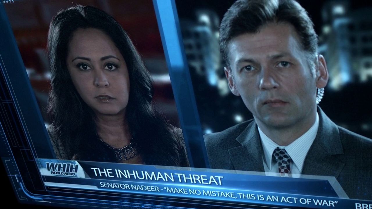 While she was speaking, Nadeer noticed that Tucker Shockley had arrived and entered her own office. Nadeer refused to let Bynum and the other staffer be dismissed as Shockley explained how he and the Superior had been discussing her work with the Watchdogs and had thought that she had proven her devotion to their cause, noting how she had shot her own brother. However, Shockley's tone turned serious and he noted that she still had the same blood as her brother and therefore had the Inhuman gene in her and could pass it on to future generations which he openly despised about her.