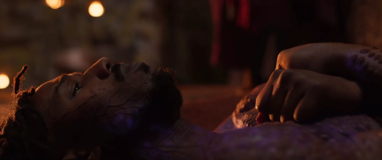 Killmonger stood over T'Challa, who was now unable to stand as he called out to those watching and claimed that T'Challa would never be able to lead them into the future and was unworthy of holding the power of the Black Panther. When T'Challa finally gathered enough strength to try and fight back, Killmonger responded by lifting him above his head before throwing him off the side of Warrior Falls, seemingly to his death while Ramonda then cried out in grief and horror.