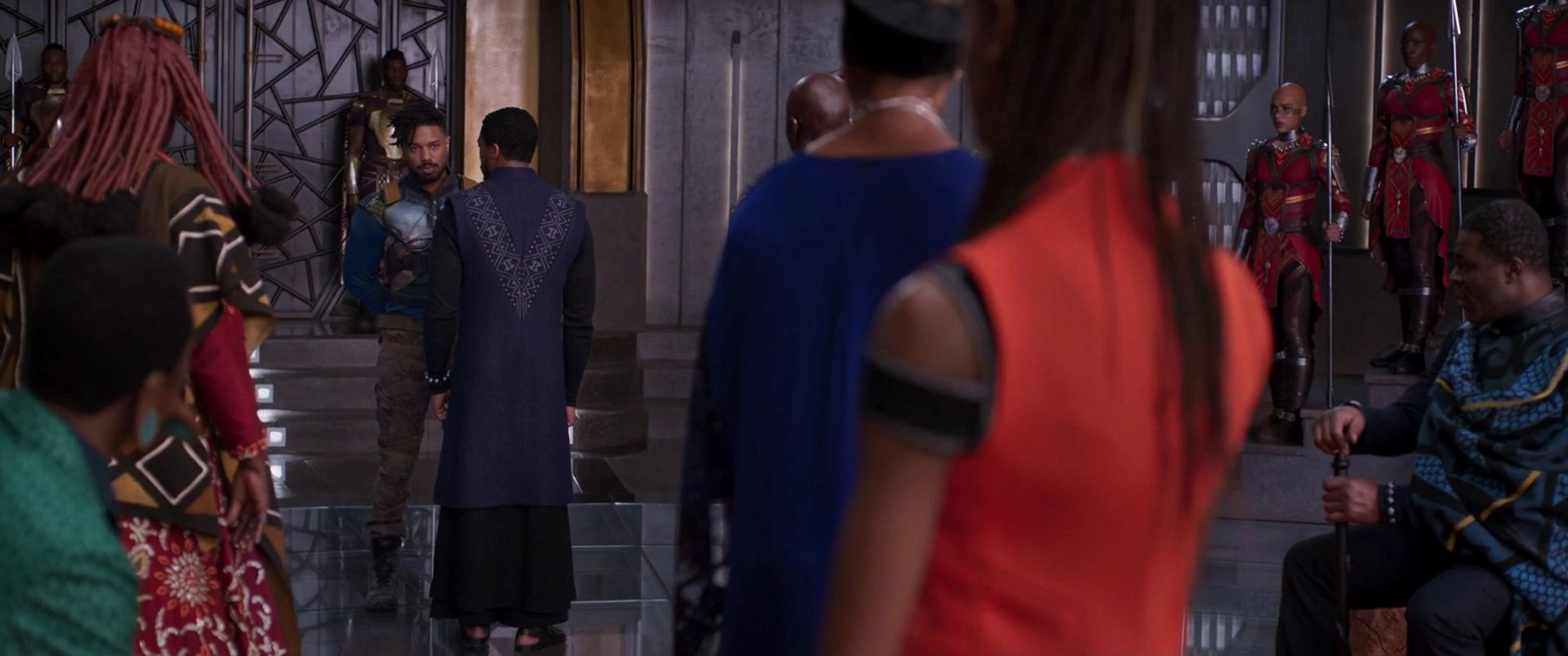 Amazed that an outsider had successfully killed their greatest enemy, W'Kabi had brought Killmonger to meet with the Tribal Council where he was presented to T'Challa, who was surrounded by his Dora Milaje, who kept a close watch on Killmonger to ensure that he could not attempt to attack the King. Once invited to speak, Killmonger had noted how he had served justice to Klaue who had been responsible for the previous Attack on Wakanda and had stolen Vibranium, noting that T'Challa had been unable to deliver this justice himself.