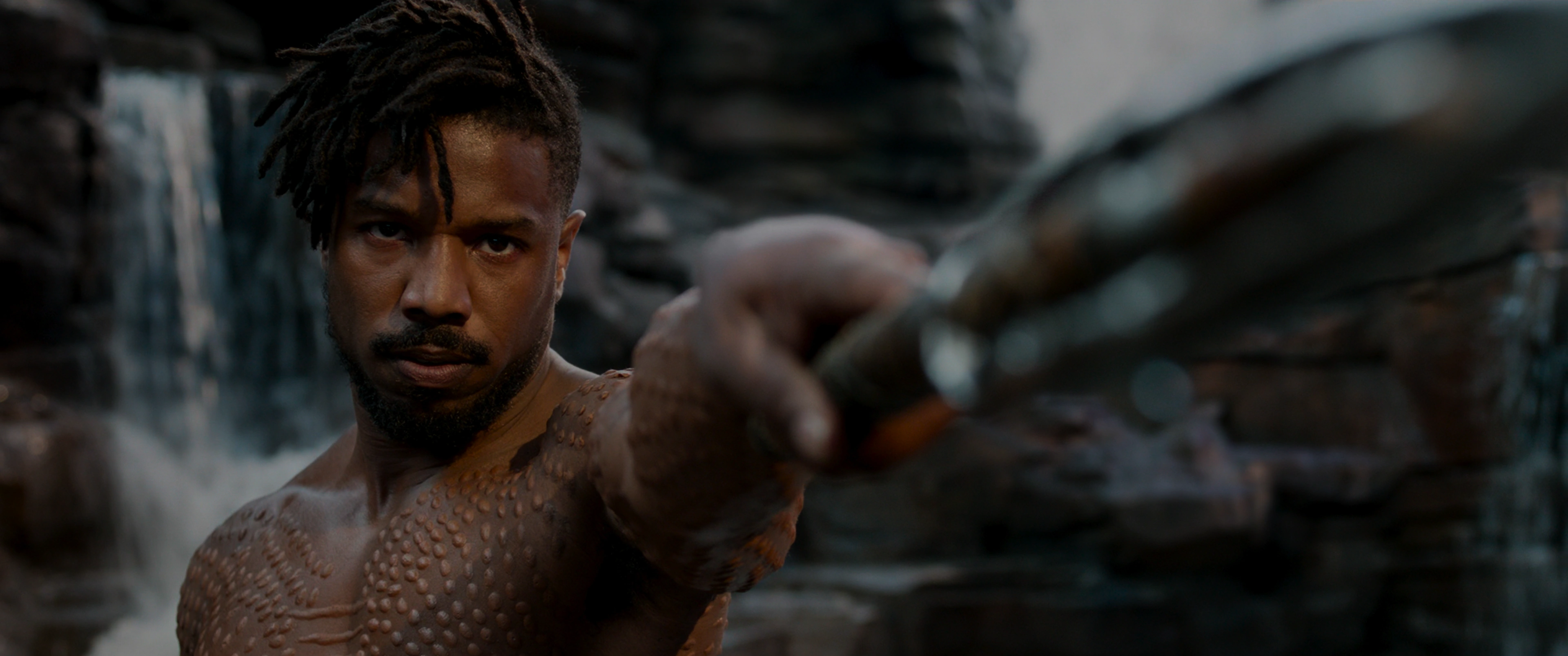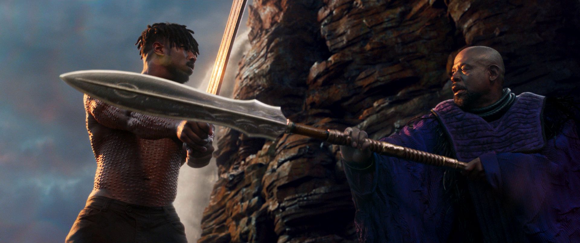 As they had prepared for the duel, Killmonger and T'Challa were both taken to Warrior Falls where Killmonger was then given his spear and sword, choosing to break the spear in half so it was easier to strike with as the Tribal Council observed closely. Killmonger watched as Zuri stripped T'Challa of the Black Panther strength, leaving them on equal footing for the challenge, as Killmonger locked eyes with Zuri, who he remembered as N'Jobu's friend and his uncle.