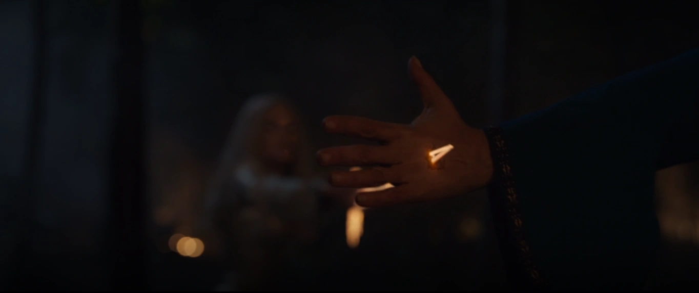 As the shooting continued, Thena began to fall under the affliction of Mahd Wy'ry. Once fully afflicted, she became violent and turned against her fellow Eternals, first attacking Sersi with an energy-generated cosmic spear, although she was saved by Makkari. Thena then stabbed Phastos, but was shoved away by Makkari. However, Thena generated daggers to stab her as well, critically injuring her.
