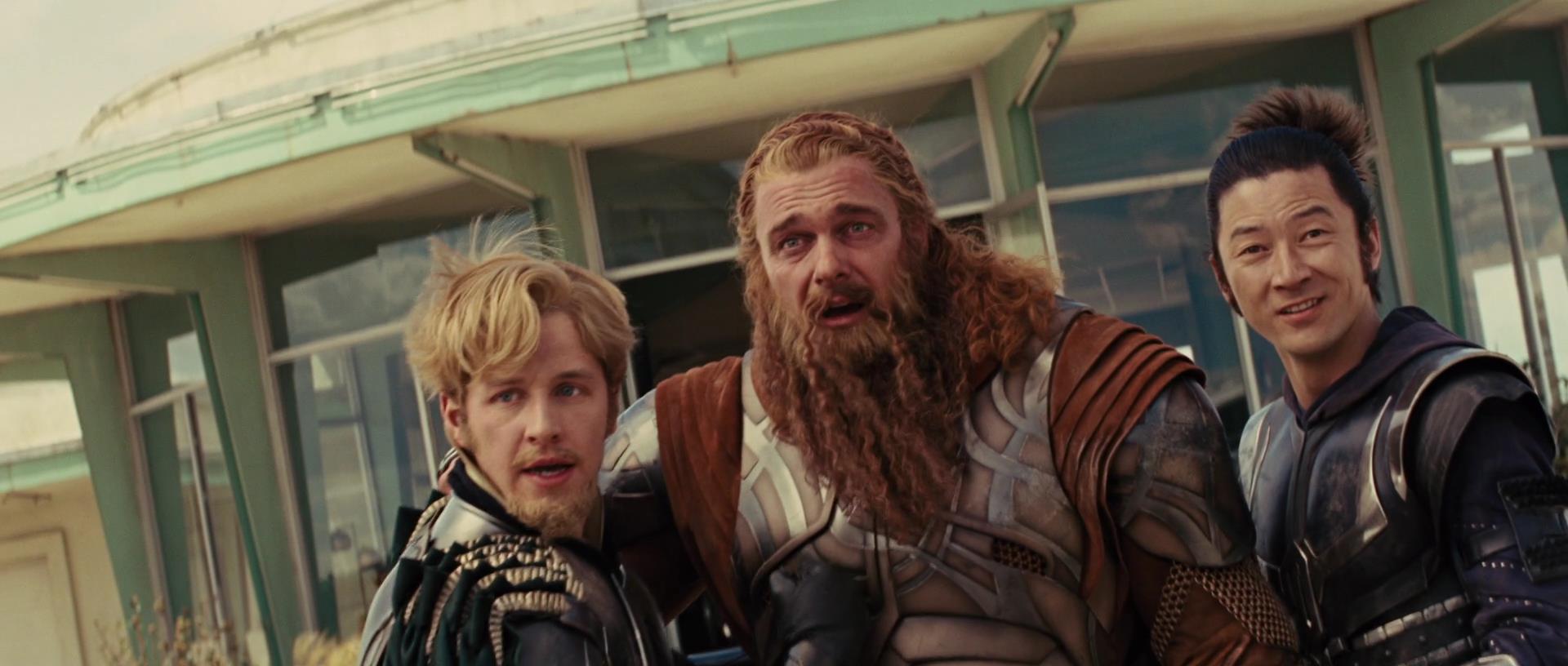 They arrived at Thor's last known location in Puente Antiguo and searched for their friend. As they all walked through the town they attracted many strange looks from the locals due to their armor and weapons, with a team of S.H.I.E.L.D. referring to Fandral as Robin Hood. Eventually, the Warriors Three had managed to find Thor with his new friends Jane Foster, Darcy Lewis and Erik Selvig, delighted to see each other, the friends hugged and laughed together.
