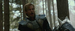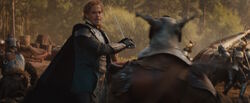 As the battle went underway, Fandral rode his horse and questioned Hogun about what the plan was, with Hogun insisting their plan was to stand and fight. However, upon seeing that the Marauders were vastly outnumbering them, Fandral suggested that they instead turn and run.[5] Making their way out of the forests, Fandral and Hogun rejoined forces with Volstagg and Lady Sif as Fandral got off his own horse and then rejoined the furious fight with all his allies.